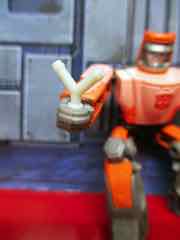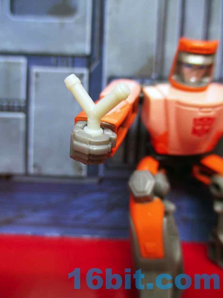 Wheelie is a nicely-painted, 6-jointed figure with a removable tiny slingshot. His knees are permanently bent, otherwise he would be the same basic height as a Core-class toy. With a little work you can get him to balance while standing, but he's designed to sit on Grimlock. There's a peg under his thigh that fits on Grimmy's shoulder, but my sample's peg is too big for the hole - so good luck with that. The deco is good, with orange and a peachy color painted on a grey body with silver on his face and nice blue eyes. I'm not saying it's a replacement for Titans Return Wheelie, but it's certainly a good supplement. As accessories go, he's no slouch and can be posed "dancing" or pulling back on his weapon.
