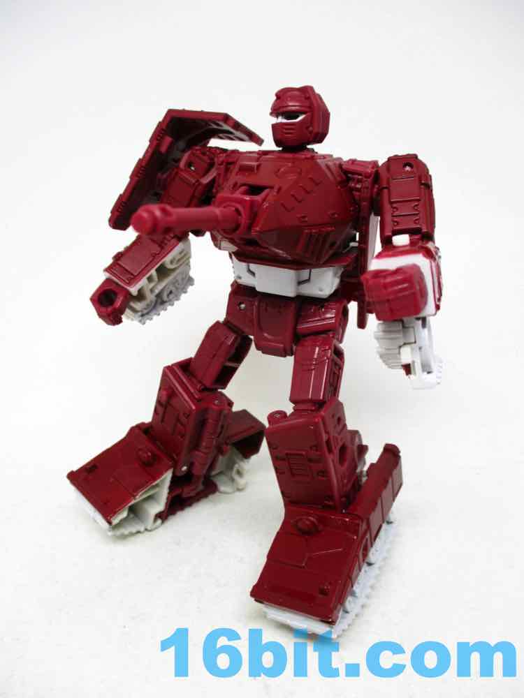 I very much like the tank - it's cute. The turret is round and bulbous, like the original toy and most likely your memory of the original toy. The grey panel behind the turret is now red, and matches the rest of the toy. There are rolling wheels which don't roll terribly well, and at this point could be dropped and most wouldn't miss them. The classic rubsign sticker is gone, replaced by an Autobot symbol. The colors don't precisely match the original toy, but they look good - they're good enough.