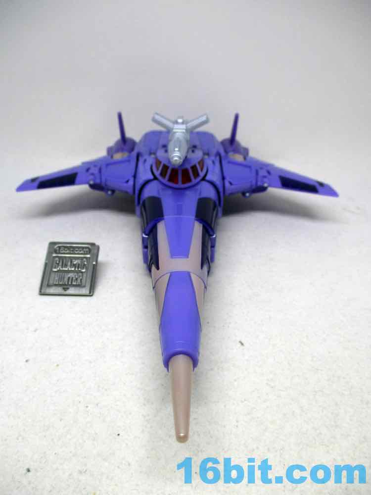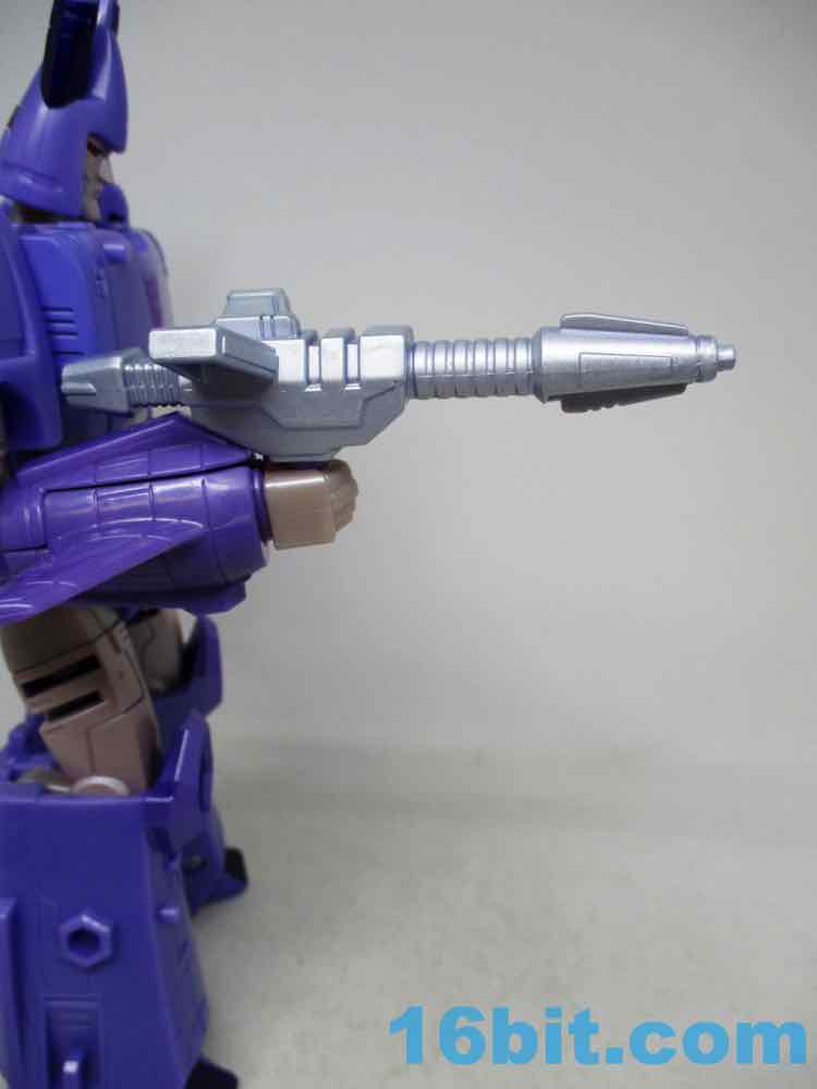 The vehicle is also one of Hasbro's best efforts, with retractable landing gear and a decent silhouette. Previous 21st century Cyclonus plane modes were either robot parts wadded up in a vehicle shape, or a vehicle backpack with a robot crouched under it. This one is more convincingly a robot that turns into a space ship. You can mount the blaster on the top of the starcraft, and wave it around and make "whoosh" noises.