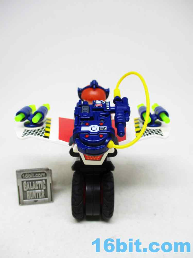 The Sky Bike assembles quickly and is mostly good - one of the wheels on mine doesn't spin very well, and two of the rockets are a little loose in the launchers. But other than that, it's basically a lot like an old Kenner M.A.S.K. toy in that it's a bike, and then it has pop-out wings for a flight mode. It's a real toy! More specifically, it's a redeco of an old non-licensed toy, which is also the kind of thing Kenner was famous for doing in the 1980s. It clicks together easily and the flick-rockets fire pretty far. Unfortunately, they don't necessarily hold in place - so the clear, neon green projectiles could fall out if you aren't careful. The vehicle has no problems holding a standard adult figure in pants, plus there's a nice mounting area for the proton pack. Unfortunately, there's no on-board storage for the beam, the trap, or the PKE meter - so expect to lose those if you aren't careful.
