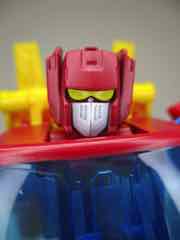 His hand-held blaster weapon looks like a hand, and it's painted silver but molded in yellow. You can mount a C.O.M.B.A.T. effect in the barrel if you like. You can rotate the wings on his back, and the light array can move too. Articulation on the robot is pretty good, with about 24 meaningful joints including double-knees and kind of weird lateral arm movement. There's a lot to like here, but the wing kibble - true to the 1980s toy - is something I'm just not fond of at all. But you can't fault them for not trying to be authentic. The head sculpt matches Hoist, which largely borrows from the animation model. It's pretty good.
