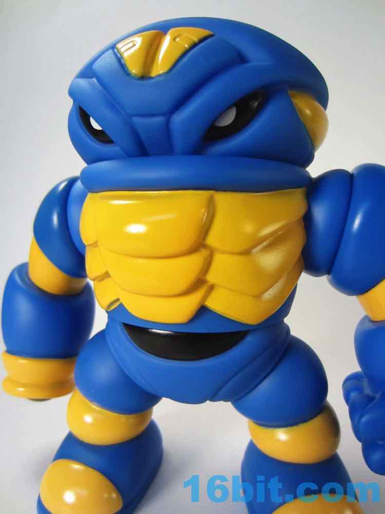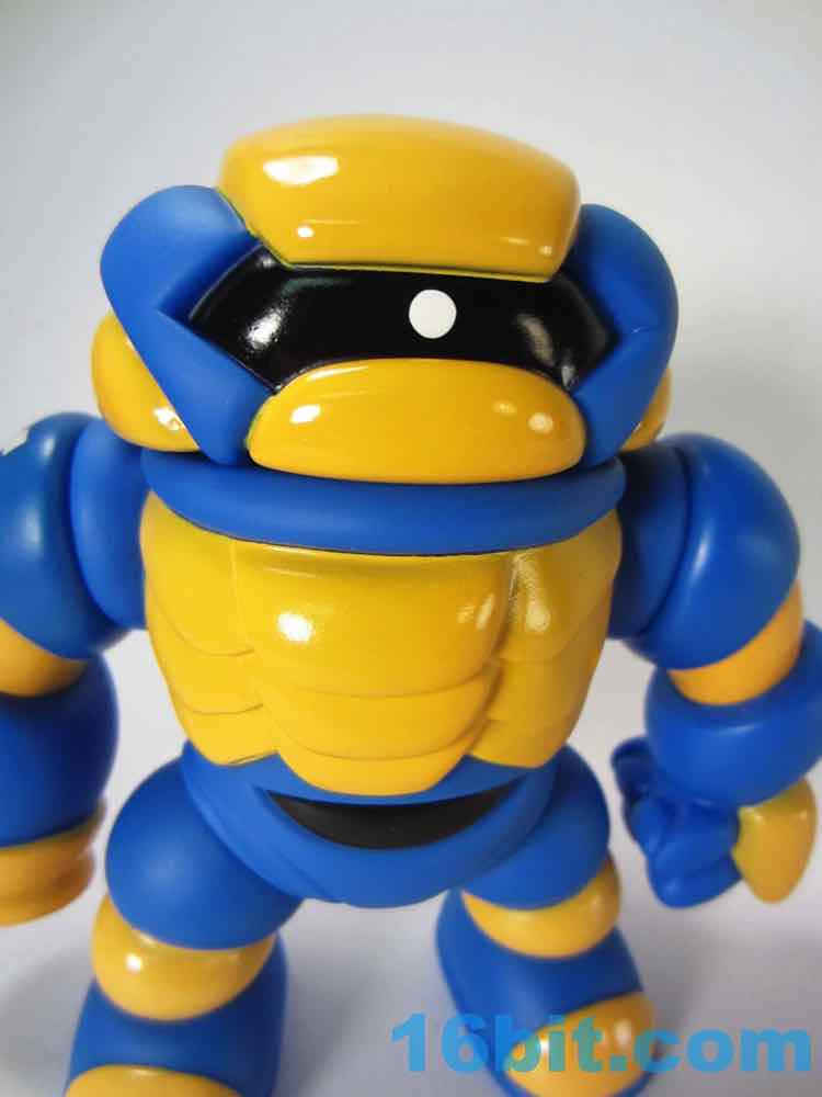 Molded in a bright blue vinyl, this figure is also coated in thick, glossy yellow paint that really looks amazingly good. Most figures get a thin layer of paint - Onell Design coats it so well, they probably undercharged us. Some older 1980s vinyl figures had the color of the plastic peek out, but not this one. It has no painted panel lines, but each yellow segment is vibrant and the big black eye has a white dot in the middle. Glossy black plastic is also used on a belt buckle and the arm cannon. Our hollow plastic friend is made up of 11 pieces that can be popped apart and reassembled. I don't recommend that you do this, as they're hard to get apart and even harder to get back together. You'll probably want to make sure the figure is heated a bit before you do this, so maybe just don't do it.
