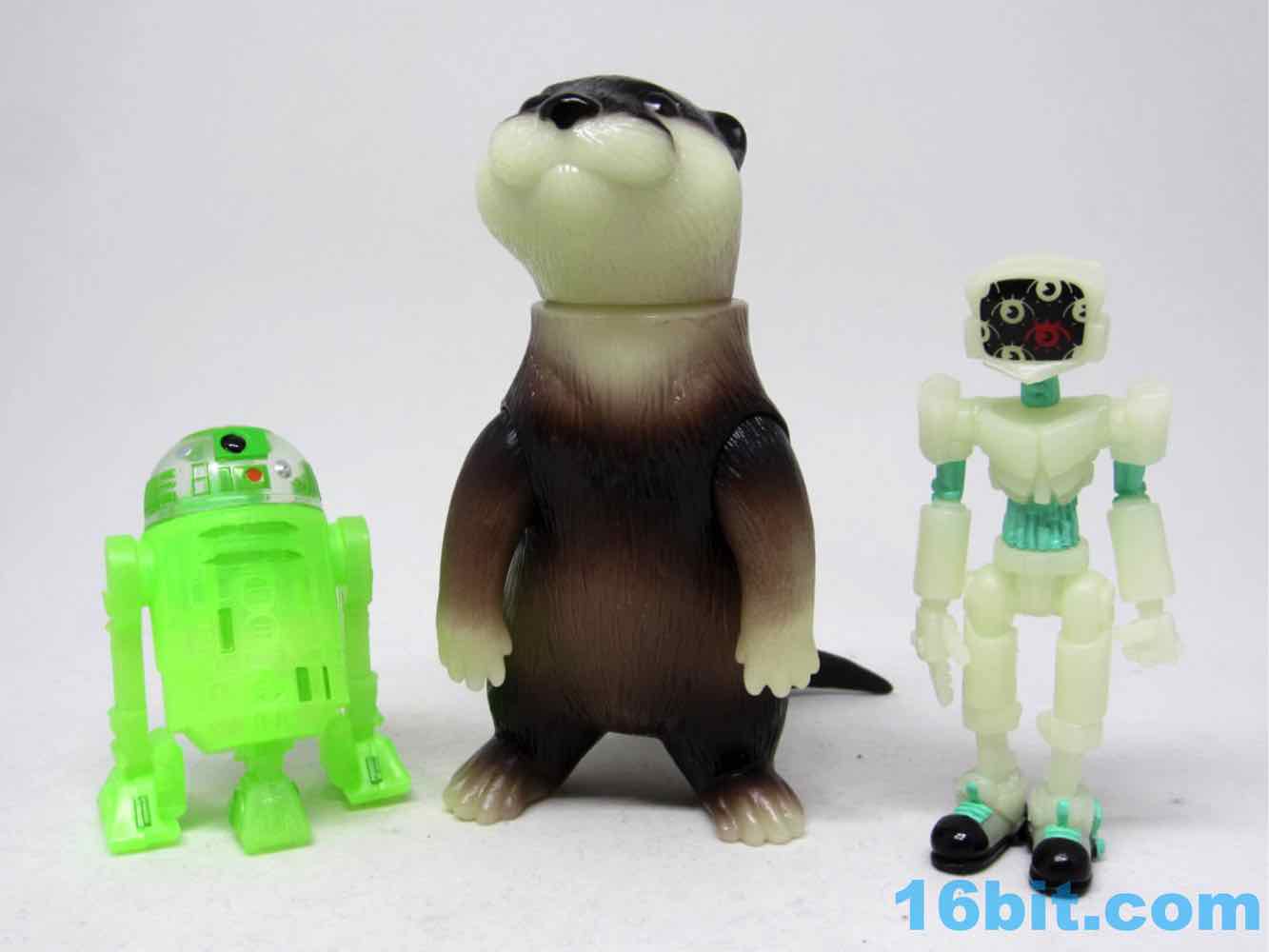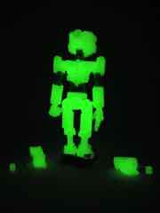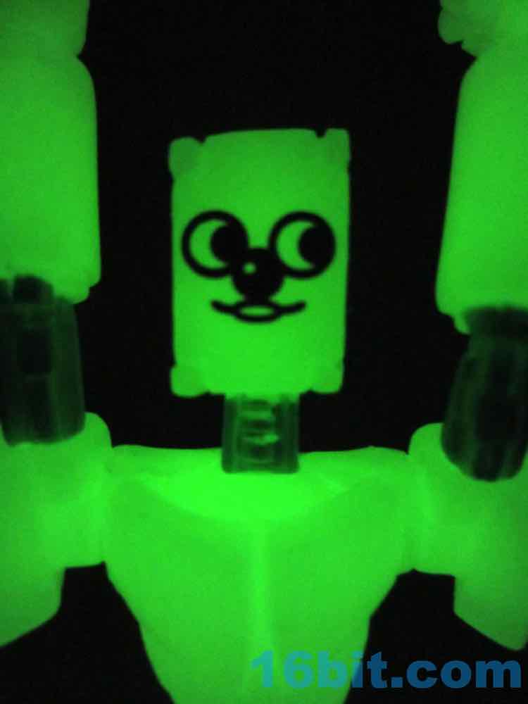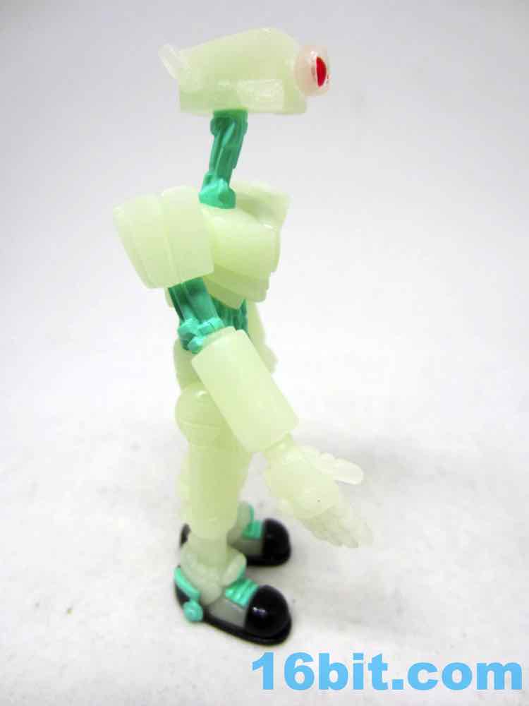 The figure itself is jointed in multiple spots with such great details as sneakers, wiring on the torso, a robot spine, and nice hands. One is open for slapping, the other is a fist for punching. The design is gleefully retro, and since it glows, it's right up my alley. He stands well and has proven to be a sturdy plastic pal who's fun to be with.