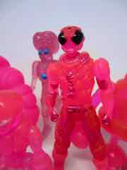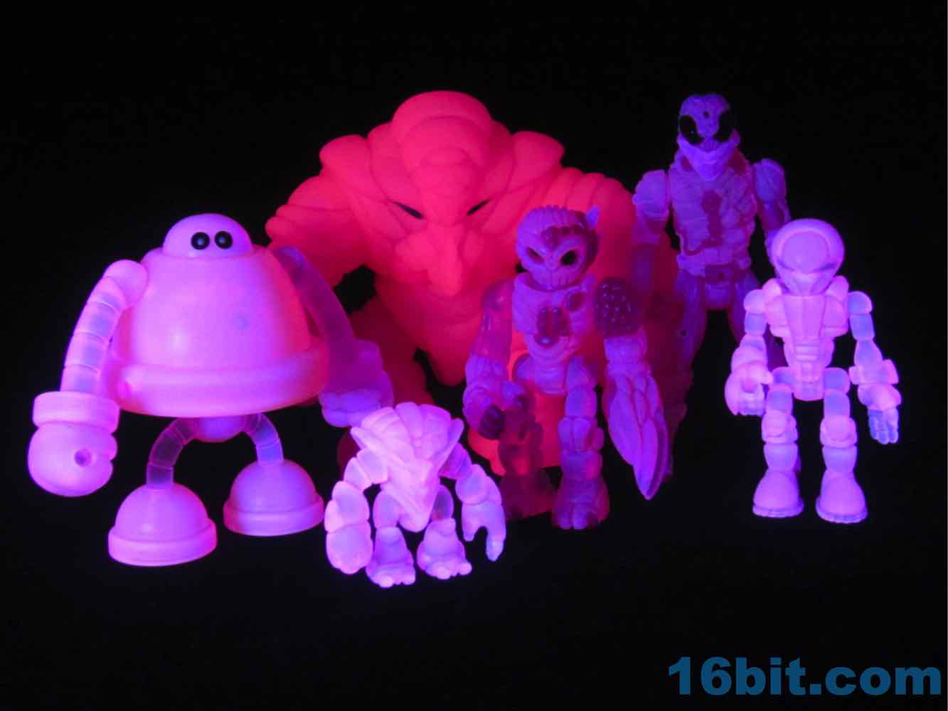 The 3 3/4-inch scale from the great Toy Pizza/Knights of the Slice line crossed over to Onell Design's shop, cast in a clear pink with metallic pink painted highlights. It's subtle - you may be able to make them out more easily in the UV light photos. The figure has some black highlights in the form of eyes and snaps, but the metallic pink is no slouch. If they left it off, you might not mess it, but in the right lighting conditions it helps to enhance the figure and show off a lot of extra detail by reflecting the light rather than gobbling it up.