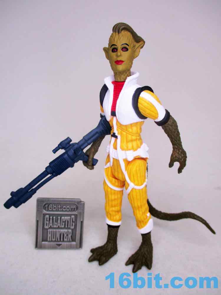 The default head has a wonderfully severe undercut, red and black eyes, eyebrows, and red lips. The other masked head is yellow with a mask, plus a red and white helmet that looks like some of the modern Cloud Car Pilots - the original 1982 one lacked a white stripe and had something that was yellower. To match Bossk's rifle, this figure comes with a painted blue blaster.