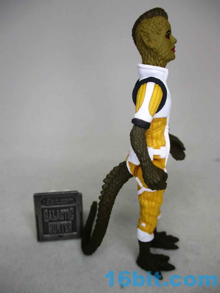 In this deco, the figure owes a debt to Kenner's The Empire Strikes Back release of Bossk - but improves on it. A lot of old Kenner figures had sculpted straps, buttons, patches, or other elements left unpainted because they were $2-$3 and you have to keep your profits. Healey needs no profits! Well some profits. The same mold we got in bare-ish glow blue or green, and a rainbow of other colors, is now molded in a mustardy yellow with white, black, and red accents. Note the thigh straps, the shin highlights, even the shoulder accents! The chest armor modeled loosely after Boushh is now white like Bossk's flightvest, and there are black shoulders and an ornament to recall Bossk's outfit. A red undershirt matches Bossk's collar, more or lses. Her painted skin is a bit darker than the Trandoshan bounty hunter, plus she has a swell tail also painted in skin tones. What I love about this is Healey Made's figure has a lot of deep grooves which look great, but when painted, those scales and corded pants really pop.