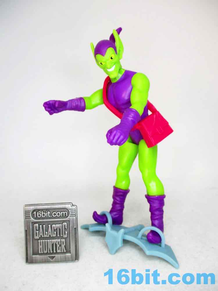 Hasbro used the same basic buck for most of the toys, but mercifully Green Goblin got some new parts to make him better. The hands, feet, satchel, and head are all new, as is the glider accessory. The chest, arms, and legs are recycled from several figures dating back a few years. It would be nice if he was a bit different in his build than the younger Spider-Man, but hey, whatever, we got one and odds are they'd be skinny had Kenner made them in the 1980s. Due to parts reuse, the green "skin" lacks the scales or detailing from the old comic books, but at least you get the pointy ears and giant, silly hat. Of note, that hat is a separate purple plastic piece affixed in palce - it looks great and should hold up to play wear. Assuming anyone were to play with it, that is. The satchel looks nice and fits well, and the figure's curly boots slip right in to the glider - but the glider won't balance with the figure standing on it. That's a downer. You'll need to make him lean forward with his arms out to balance, or put something under the glider to keep it up.