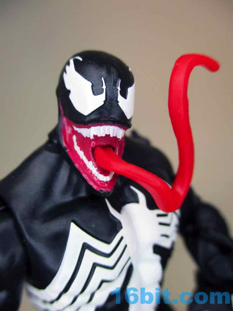 This 2023 Venom is superior to previous releases in my toy box due to the articulation being good and the big feet helping him stand up when other figures are being carried and abused by him. He has even bigger hands which easily grip Spider-Man's arms or legs, and the sculpted toe feet give the figure a little more personality as opposed to the socks we usually get. There are some symbiote spaghetti bits twisting off his shoudlers, plus a big red tongue flying out of his mouth. He's quite literally oozing with personality.
