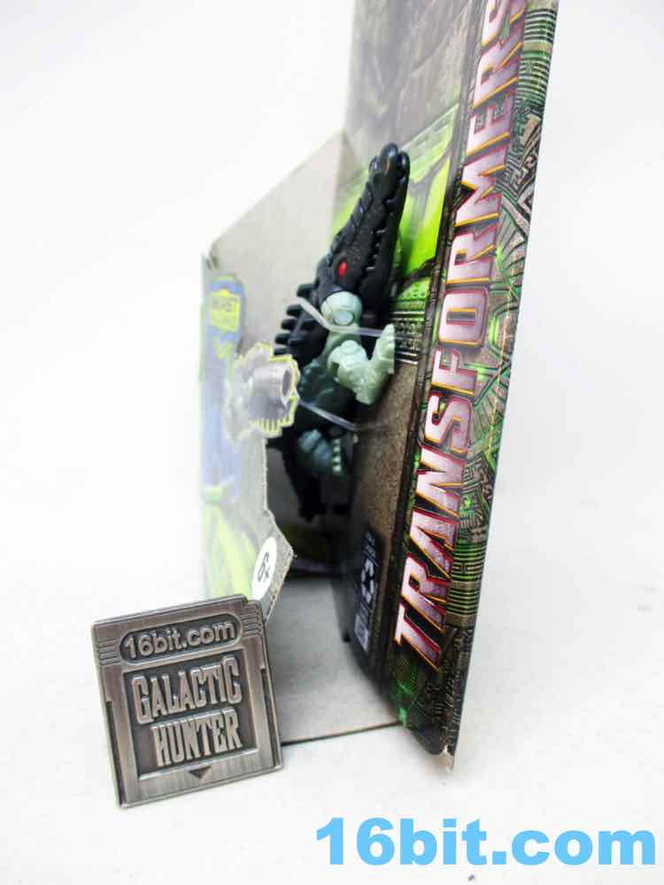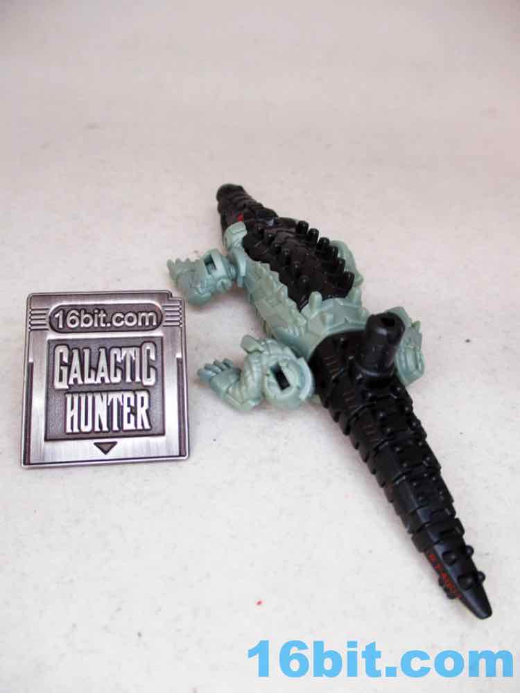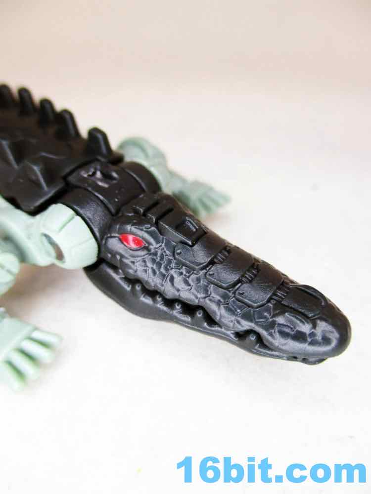 The 4-inch snout-to-tail robotic reptile looks pretty cool with two colors of green plastic with painted red eyes and a silver blaster belly. The detailing is great - some is robotic, some is organic. He has ball-jointed legs and an opening mouth, and the mouth doesn't have a painted interior. The claws aren't painted either. Normally I wouldn't expect anything like that, but, again, $6.99. He's got no blast effects or other parts to plus him up, either, but at least he looks really cool.