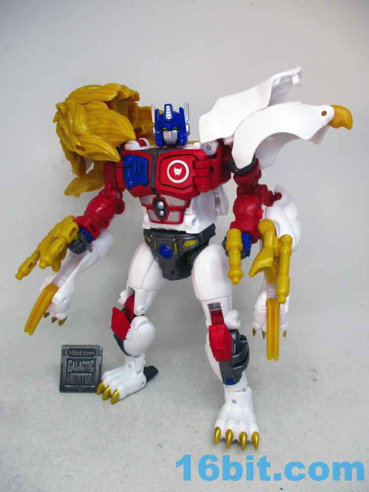 The 6-inch robot mode is pretty great. There's a lot of articulation in there - no wrists, sadly - but the joints are pretty sturdy and you get rocker ankles. You can pop open the Maximal logo on the chest to reveal a painted area where the Matrix lives, and you can connect C.O.M.B.A.T. blasts if you have any handy. He has no problems holding or using his accessories, and he stands like a champ. If he didn't transform, I'd say he's a pretty good toy for the price. It's of comparable quality to a lot of the 6-inch humanoid figures you can guy these days, except this one looks like a cartoon Optimus Prime lion with fuzzy slippers and flip-out claws that live in cat paws that hang off the back of his robot arms. You don't see those every day.