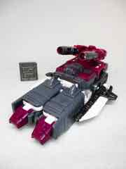 The vehicle mode is bigger than the original, with the legs jutting out forward and giving him a totally different silhouette. As stated above I do not recommend stowing the blade weapons or any weapons in the tank treads since I experienced some paint coming off, but you do you. Who am I to stop you from making a mistake? The designers did a good job, but that pairing of paint and plastic make it hard to be excited. Any time you pick up a toy and need some sort of "well be careful because playing with it as intended may cause problems" really irks me and puts me off buying more of this kind of stuff, which I admit is funny given how many I've reviewed. But hey, times change - if something's not great, you don't have to keep going. The vehicle has no working wheels, but the turret on top turns and I like that a lot. I would not recommend putting anything in those tank barrels either, as that paint looks like it might be similar to what was used on the treads. At least the sculpting is good, and a repaint of this toy might give you fewer problems.