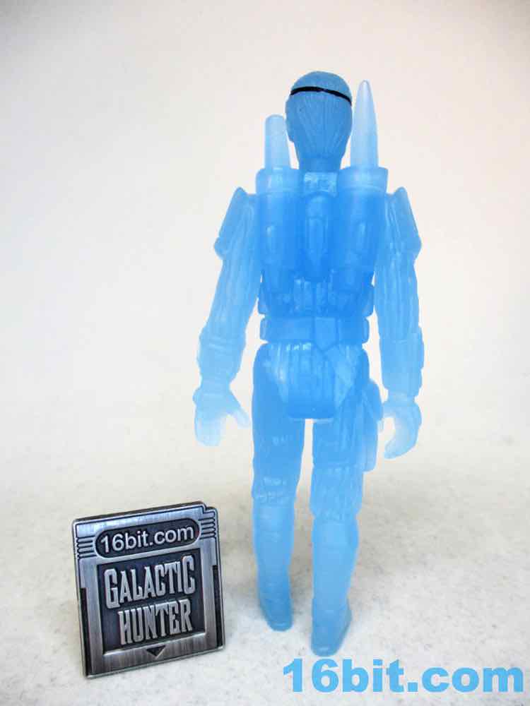 The Raider sculpt once again gives you what appears to be an eyepatch-wearing Peter cushing head, a cyborged hooded Cobra Commander head, a retro blaster, and an armor-wearing figure that looks like it was inspired by but completely distinct from the school that gave us Boba Fett. The classic bone-colored green glow absorbs a lot of the sculpted detail, but the blue reflects just enough that you can make out a lot of the sculpted details. The Darth Vader-esque vertical lines on the body suit are easy to see here, as is a little screen on the wrist armor and a nice big belt. Both head have limited painted elements that bring out the eyes and eye-adjacent elements with black paint... and that's it. I bet the Healey Made crew could run a version two of these guys with a little more paint on them, but they probably wouldn't be $20.