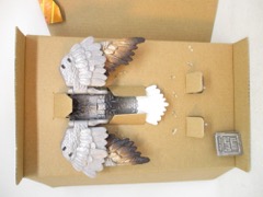 His only accessories are a pair of very large feathers. They can tab on to his wings, or you can put them in his fists as melee weapons. They look a lot less like spoons this time, given the improved sculpting and the gold fading to a black tip deco. The designers at Hasbro clearly read the reviews of the original toy and took notes.
