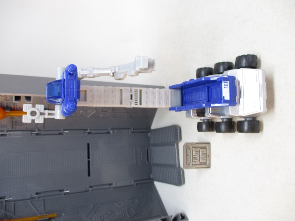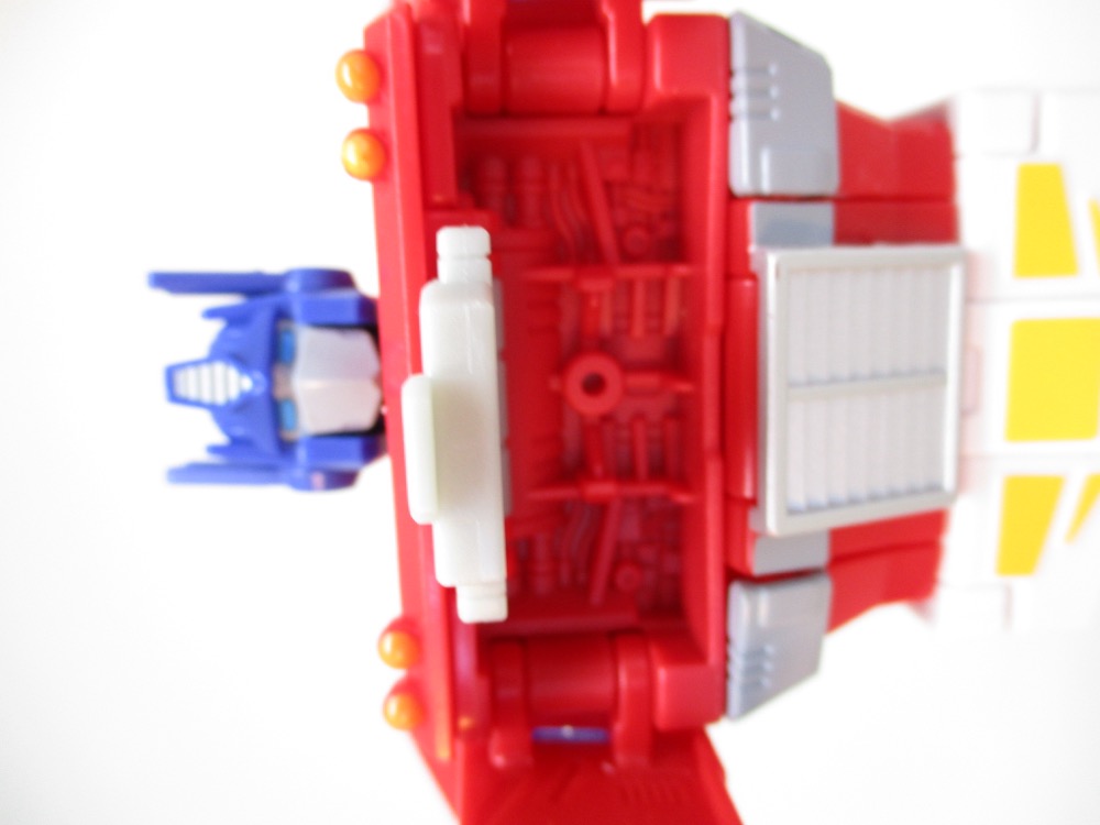The truck is very much like other flat-nosed red trucks - the blue section is a bit thicker for all the leg folding, but it looks like most Optimus toys. The wheels turn, it's red, there's at least one Autobot symbol on it, it's pretty good. The brake light parts were switched during assembly on most if not all units, but it's not exactly a big deal and there's a fix. The truck itself doesn't do much but carry the trailer, which is more or less what you want here. There is, however, a new feature.