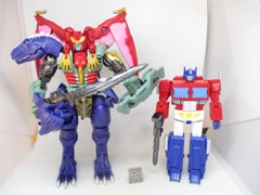 Purely as an action figure, he's taller than most non-combining Optimus Prime toys from Hasbro. For the price, he needs to be - and he has multiple joints on his hands, including his index finger, plus the usual rocker ankles. Everything works really well, and I had no real challenges getting poses out of him. His shoulders even have extra joints, should you need to light their darkest hour or do special photo shoots with your fancy camera rigs. With the larger Dinobots, this enhanced stature will probably make Optimus your new default in any diorama, with the rest going to the back of the shelf, or a bin, or eBay. They're all still very good, but if you're looking to make a cartoon cast diorama of any kind, I can only assume this will be everybody's new favorite.