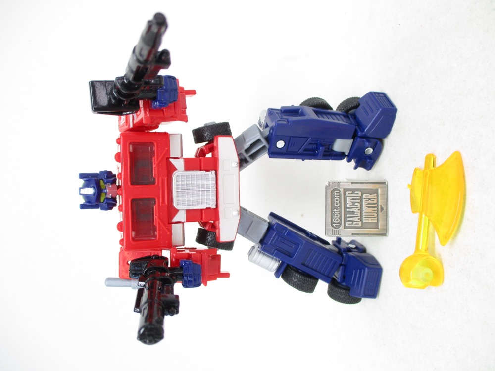 His accessories are better than expected. You get two blasters based on original toy (and revised variant) designs, an energy axe, a Matrix of Leadership, and two removable smokestacks that also work as blasters. While he doesn't have many 5mm sockets, he has enough to store the items in robot mode and truck mode so you won't necessarily misplace them.