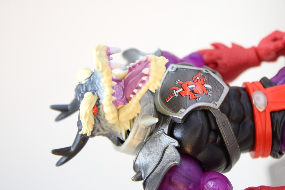 It's a neat - if chaotic - design. The wings are huge. The classic Ninjor symbol on the chest no doubt influenced the very nicely sculpted dragon head with painted teeth, gums, hair, and an articulated jaw< I liek the armor, the costume is pretty great. It's a neat mutant figure, making the most of the parts reuse. For twenty bones, it feels like a worthwhile purchase.