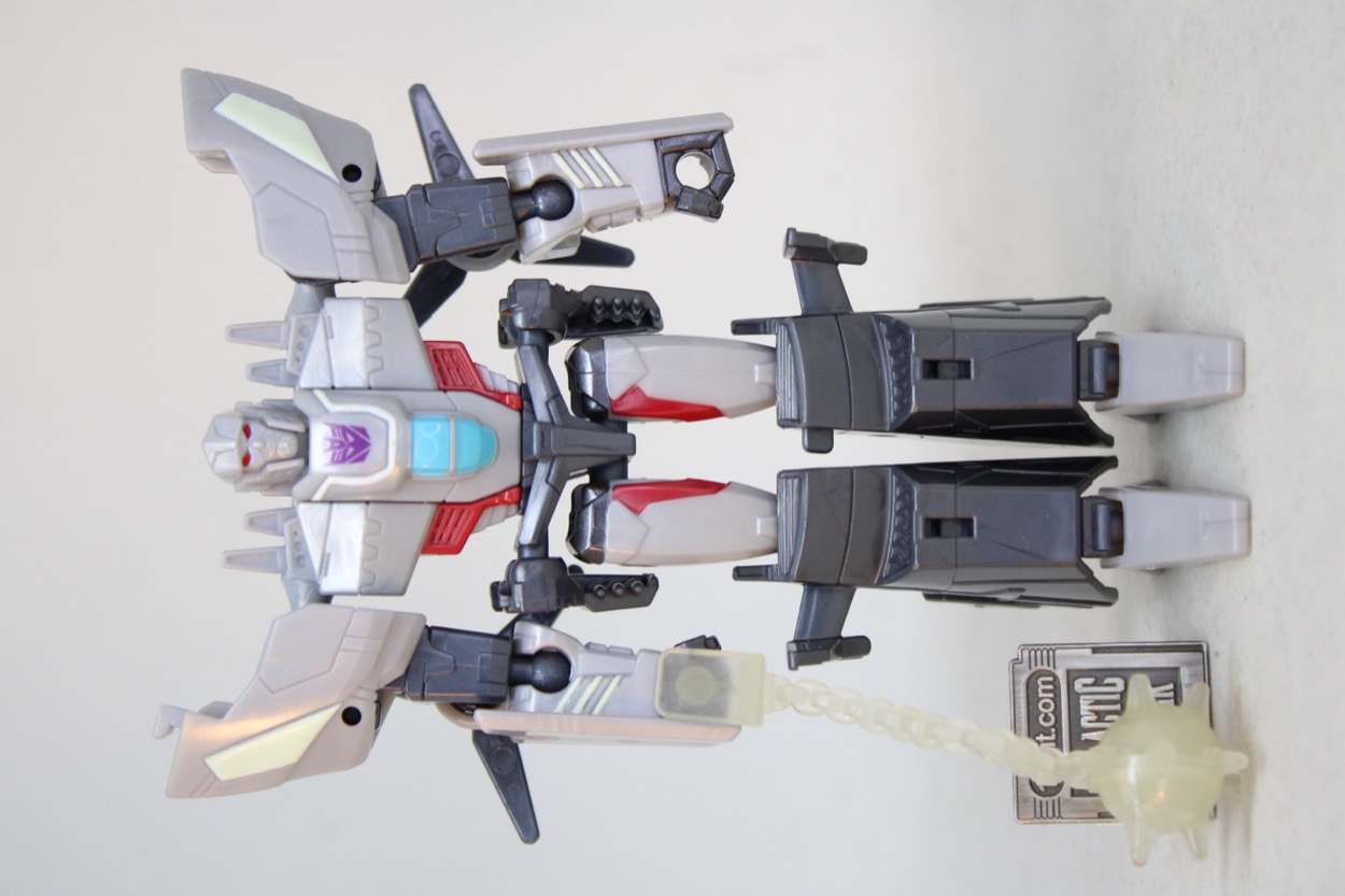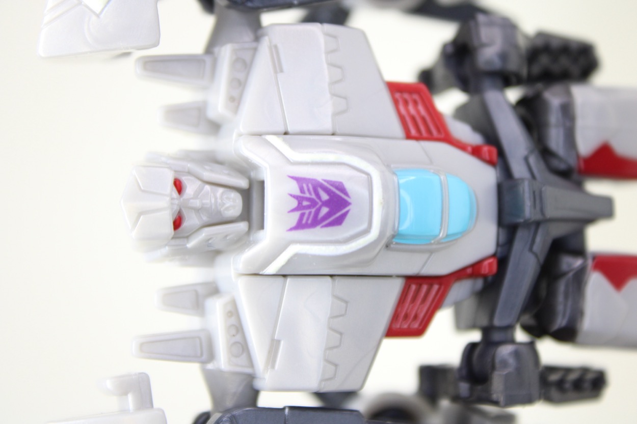 Deco is pretty good. Red on the chest and thighs looks great, and if it were left off I'd not miss it. The fists are painted gray, with the rest of gray parts being primarily molded in color. The blue cockpit and purple Decepticon logo look great, but the reason I bought this figure were the glow-in-the-dark bits. There's a line around his Decepticon sigil, three lines on each forearm, and two big patches on each should painted in very nice glow paint. I wish more things glowed, but everything that does glow does so nicely.