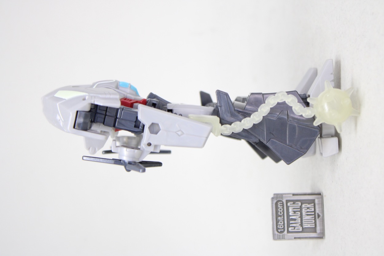 His chopper mode is fine, but not amazing. The blades lock in place, and it's very clever. But it means you can't position them any other way - how it looks is how it is. The blades spin nicely, but there's no landing gear and not a lot of paint. In this mode you can see the glowing lights in the front, with the robot's chest lights hidden behind the cockpit and the forearm lights rotated out of the way. I'd say the size and general vibe is roughly below that of a 1990s Deluxe-class toy which, adjusted for inflation, is pretty fair. A $10 Deluxe from 1996 would be about $21 in today dollars.