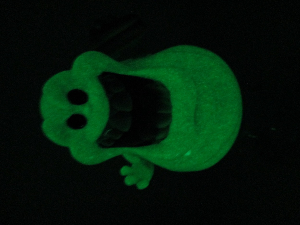 The chase figure and the regular figure look identical - I only photographed the glow one. It's a perfectly good glow color, not quite as bright as I remember him on TV. The eyes are black, the slime is this really nice glossy color. Unfortunately, like the Devo figure, the glow is pretty terrible. When exposed to UV LED, it's pretty weak. When exposed to a CFL bulb it charges OK, but the glow fades so fast it's hard to capture on camera. It needs the Sun to really get much out of it, and even then it's not super bright. The left arm not glowing is probably a fluke on my figure, but it's also just one more thing that would make me say you probably shouldn't bother chasing this one down unless you must have everything that can possibly glow in the dark. Your money is better spent elsewhere. I'm looking forward to seeing how Hasbro's Ecto-Glow "The Green Ghost" turns out in the coming months, as their figures react well to UV and amazingly to the Sun.
