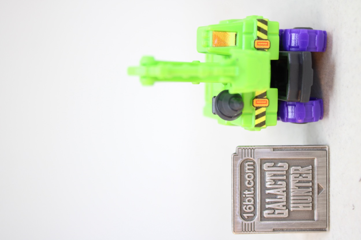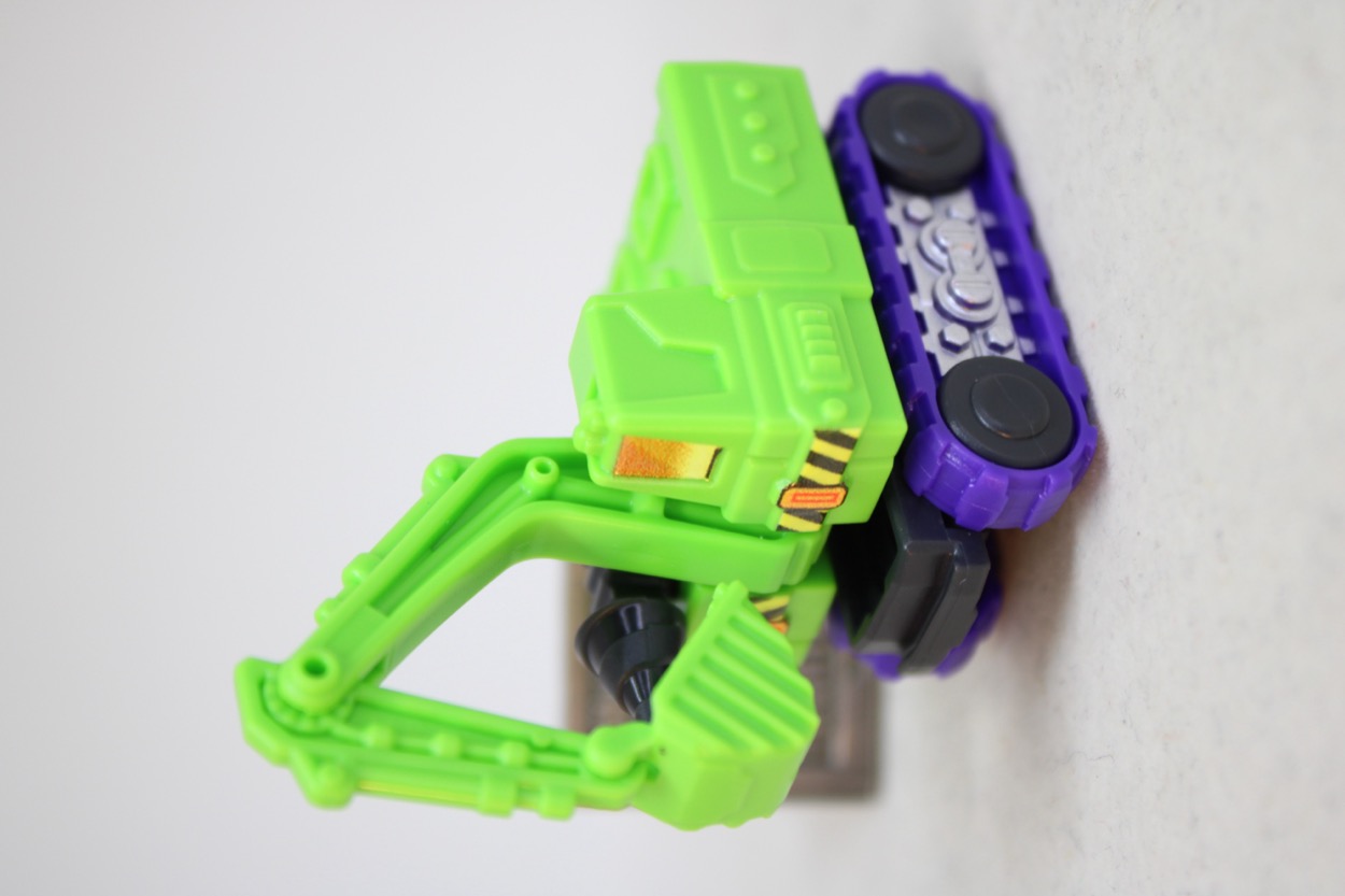 Scavenger has a jointed shovel arm, wheels that don't spin due to the hard plastic treads, and a joint so it can pivot. All of this serves the bigger combiner robot too. It's molded in color except for extensive decoration on the front bumper and window, plus some silver on the treads. I think it looks great, and if this were a vehicle that existed solely for its own sake? I'd say it's worth the three bucks. It's squat and has just enough detail and texture that it doesn't fall flat. You may have other Devastator toys, but this is a pretty good one if you don't. These things technically can't transform, but being able to mash together vehicles into a big guy is an interesting licensing workaround.