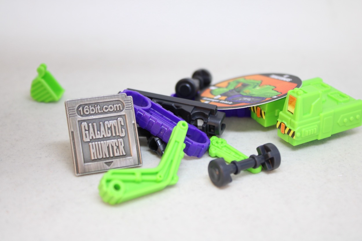 When I first had a chance to hold the Scavenger Vehicle from Blokees, I immediately clocked some little sockets that seemed to indicate hooks for future plans - and I was not disappointed. The construction vehicle also can be Devastator's shoulder - that's pretty awesome! The other green vehicles were sold in the first three waves of these guys, with a torso kit sold separately for a few bucks. You might have to buy three whole cases, but you get a nice and fairly big figure out of it.