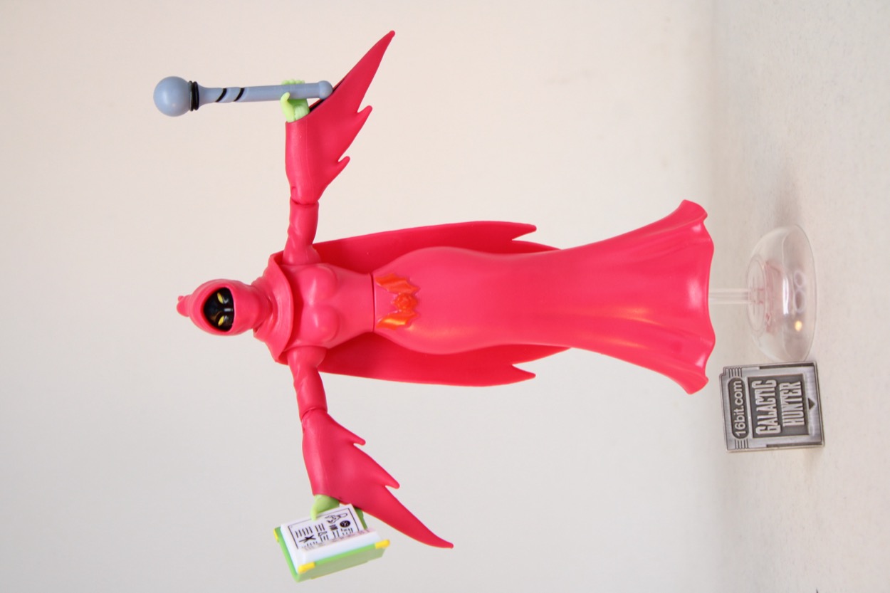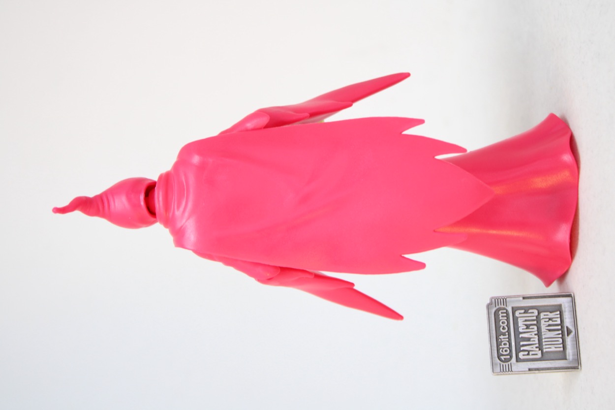 Standing at about 5 1/2-inches tall, she doesn't have any legs. Her dress is hollow, and there's a plug underneath that can fit Cartoon Collection Orko's stand. (No stand is included.) The figure can split apart at the waist. Super7 made their "Classics" figure split just under the bust, which gives the figure a cleaner silhouette. Her arms are jointed like most figures in this line. The elbows, shoulders, and wrists all bend and swivel. The neck is jointed, and there's a cape.