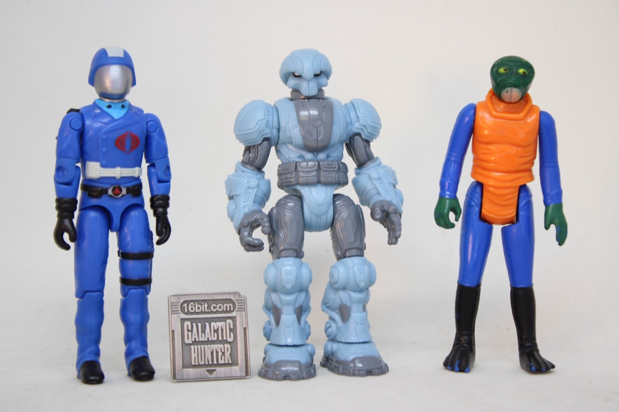 The belt is optional, and engineered for this particular body. I'm assuming it's a separate piece for a reason, I imagine we'll get alternate belts down the road along with alternate heads or other elements to make different characters. Each of the three heads can wear the newly engineered scarf, and you can also swap in any of a number of existing Glyos-compatible heads on the nearly 4-inch body. All of the joints are smooth, and it's pretty easy to pose or pop apart and swap with other figures. (See below for pictures.)