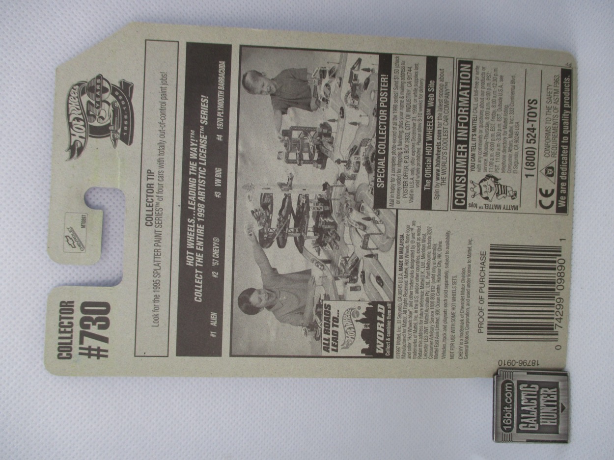 Cars with murals on them are a normal sight on Hot Wheels pegs today, but they usually cost $6 or more with fancy rubber tires that don't race well. The art is better today, and I admit the silvery plastic makes me nervous with its swirls. Maybe it'll survive! Let's hope! The art looks great, but the black layer tucked under the white dots looks a little odd. She the art looks like it may have been layered incorrectly, or perhaps the dots are too big and just drown some of the black inking. It's still cool, and I still dig it. It's also a lot more interesting than a lot of the deco on the average $1.25 car today. That's not meant to be a knock, as there are literally hundreds of cars available this year. They can't all be winners, and to be fair neither were the fleet sold in 1998.