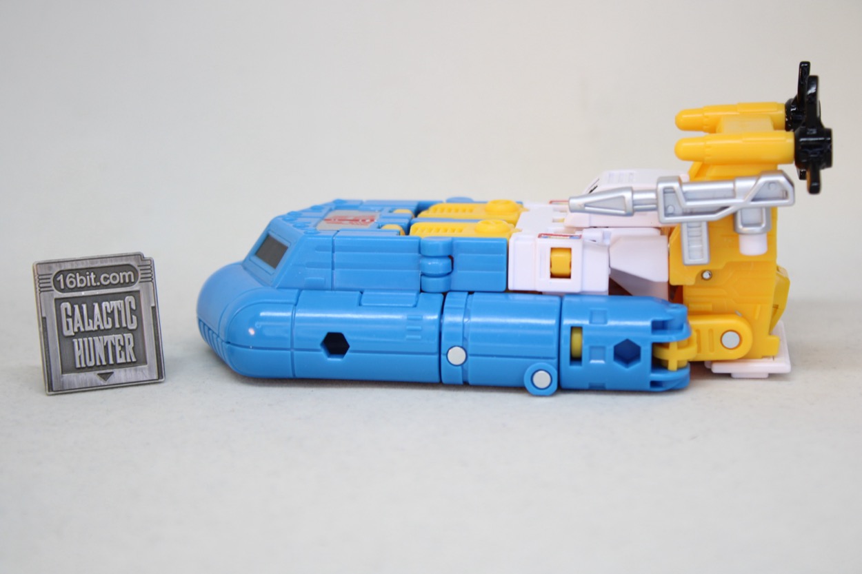 Due to the many folding, tucking, and rotating bits, there's not exactly a solid vehicle mode. The original 1985 toy felt like it started with the hovercraft and pulled a decent, simple robot out of it. This toy is riffing on that, ditching the wheels and solid base in favor of a hollow undercarriage to fit the various leg elements. While not huge, the 30% or so hollow 4 3/4-inch vehicle is satisfying. It's got a nice build that feels like a deluxe toy. It's more than a mini vehicle in a big box, it's a pretty decent vehicle with a fairly decently sized robot. They also crammed in some 5mm ports on the sides so you can add on gear, with a peg on the side of the yellow fan section for blaster storage. Personally I'd have found a spot for the blaster under the hollow section, but that's me.