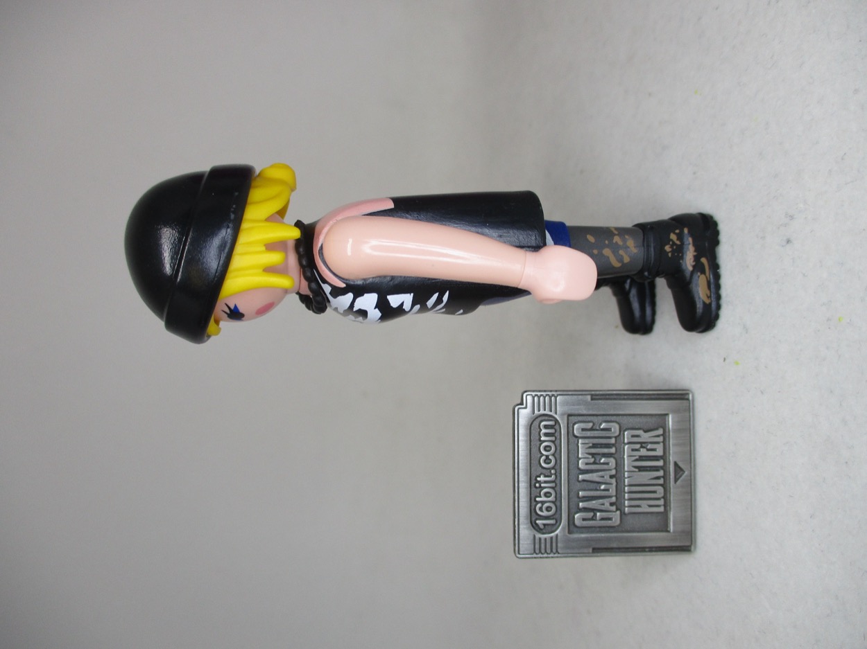 And the pink bag girl figures are amazing. Sure, you might get a big poofy dress, but you might also get somebody like this. She has an awesome black and white camo pattern, what I assume is a brown leather cuff, jorts, tights, boots, and mud deco on the boots. Mud! We don't even get mud on most of the farmer figures. She has blue eye shadow, pink cheeks, and great yellow hair. And attitude, which is rare on these figures. If you just need a random figure to fill out any sort of crowd or street display, this is it.