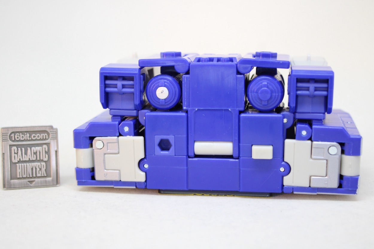 This new SS86 Soundwave is taller, lighter, and sleeker than the Seige space ship that got retooled as a Netflix tape deck which was repackaged for Legacy. Hasbro added in some wacky unfolding shoulder joints that let him pose much more dynamically with a blaster, but the new arms can't push his own "eject" button. I find that a bummer. The sculpting is much sleeker, with less ridges, lines, and greeblies. That's what they should be doing with a cartoon-specific line, but it still has elements of the toy. The clear chest window, for one, has a little unpainted arrow sculpted on it. I would've gone with an opaque tape deck door, but that's me. The figure dropped the light-up eyes and looks all the better for it.