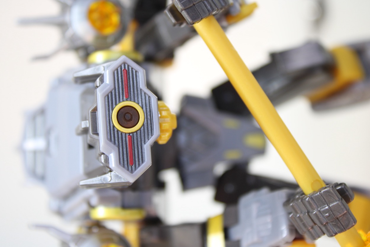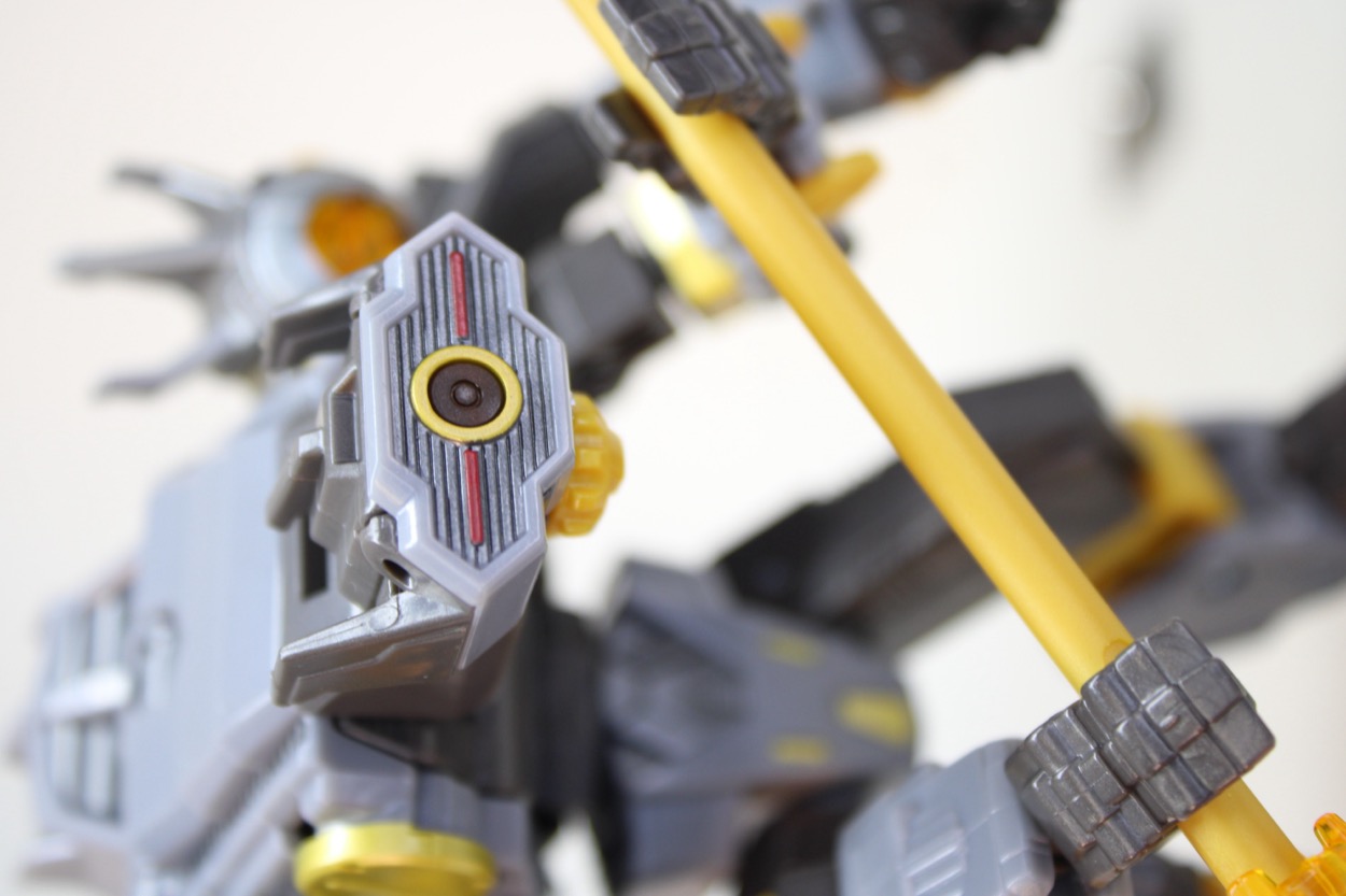 I'm more fond of the robot design than the engineering, which seems unfortunate for a robot that's clearly wanting you to play with it and be creative. The big robot mode is imposing and nifty, looking sort of like a heavily modified variant of Shockwave. He has the wings on the sides of the head, with one big eye with sculpted (and painted) lines. The simple shapes stand out as distinctive in this line, recalling some of the non-Takara very special guest toys that made up the original The Transformer in 1984 and 1985.
