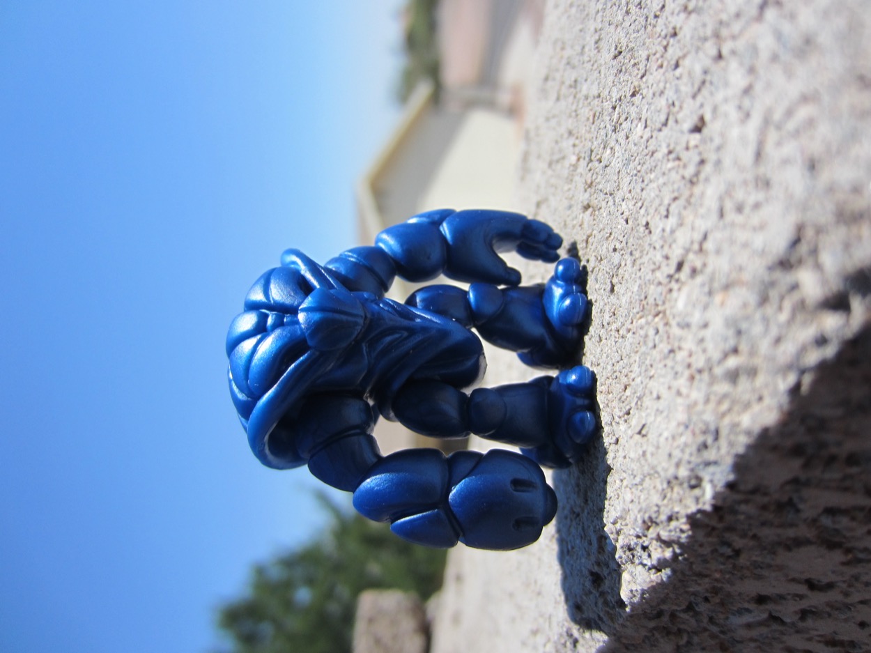 The little guy has four joints and can pop apart at each one. The arms and legs are swappable, but I like it as it is. The blue plastic shows off enough detail that you don't miss the paint, and the distinctive design still looks like a drawing sprang to life. He's sized to fight your Battle Beasts and Defender-sized Blokees figures, and was one of the smallest Glyos figures of any kind until the last few years. There are also at least four metallic blue versions of him - and it's really hard to tell which is which unless you have others to compare him against. Good luck there. They tend to be inexpensive when they pop up for sale, and I assume these were produced in the low hundreds.