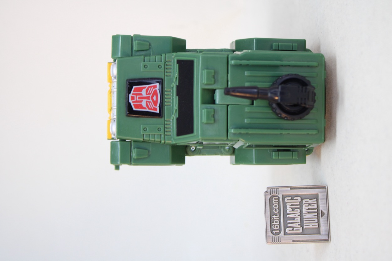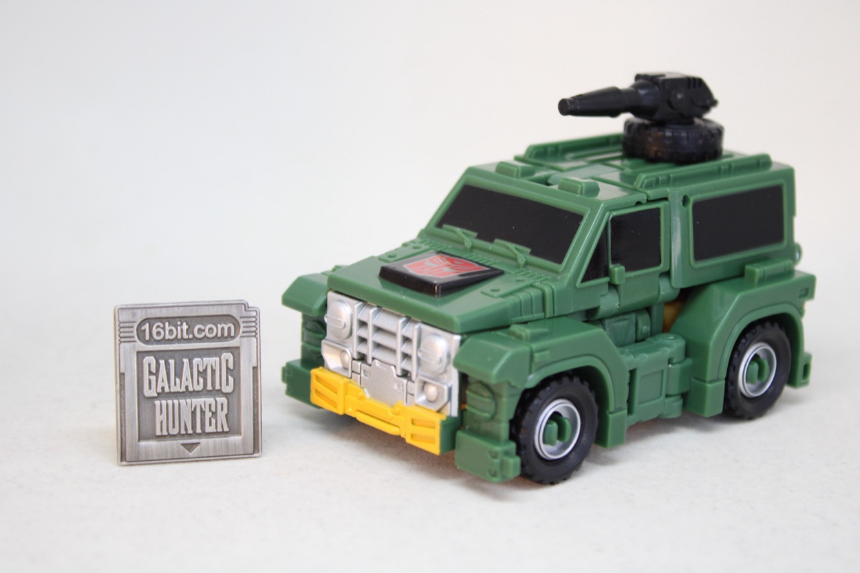 The sporty jungle car is colored a lot like the original toy, with greener plastic, black windows, and a hood ornament that combined the black square of the toy with a painted red Autobot logo complete with silver border that matches some editions of the old toy. The wheels have some silver paint, the gas tank with the big X is on the back, you've even got the black spare on the roof. I think Hasbro totally nailed the vehicle here. The only way to make it more accurate would be to leave some black paint off the side windows, and I wouldn't want that. I like what Hasbro did here.