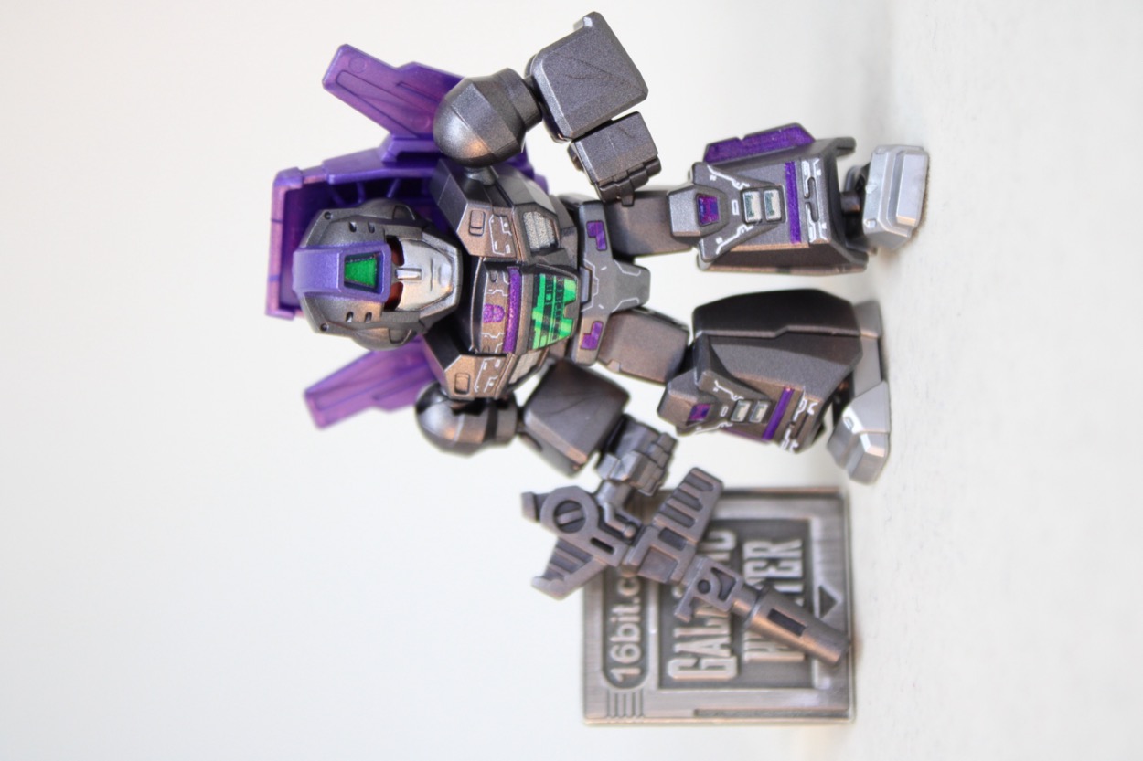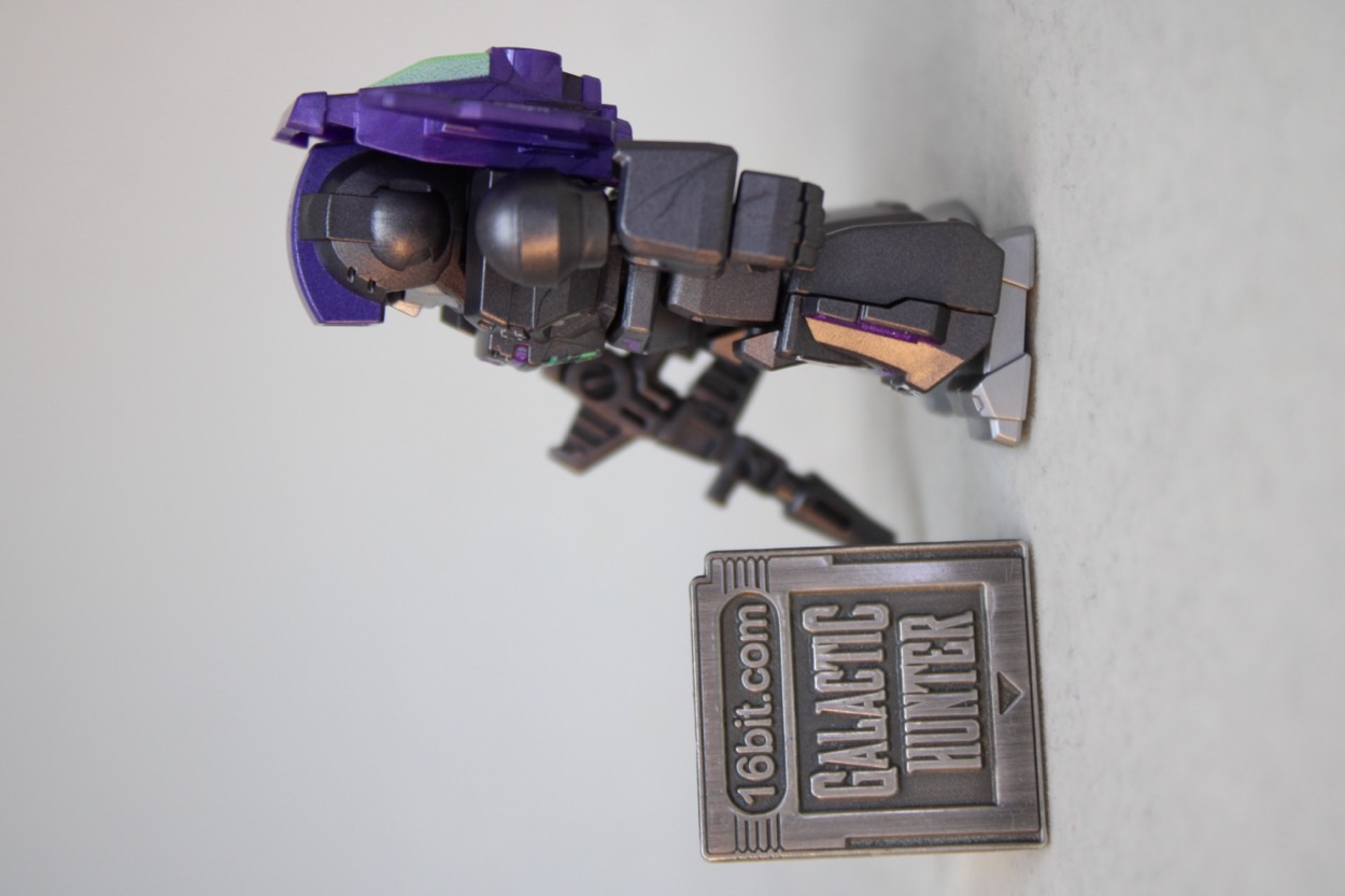Assuming it doesn't shatter, I really like this figure. The metallic gray color really sizzles, the purple metallic paint cooks, the lighter silver feet look great too. The green on the chest and back are no slouch, and you can't deny the red eyes behind the visor look great. The impressive cockpit/wing backpack has a lot of decoration on it, plus two backpack holes. It looks great - and is the only deco you'll see on the back of the figure.