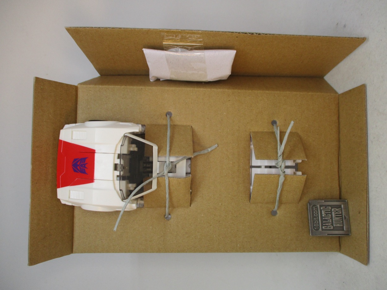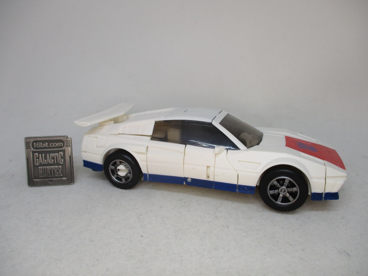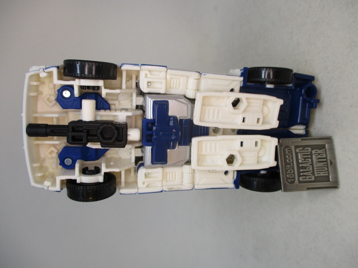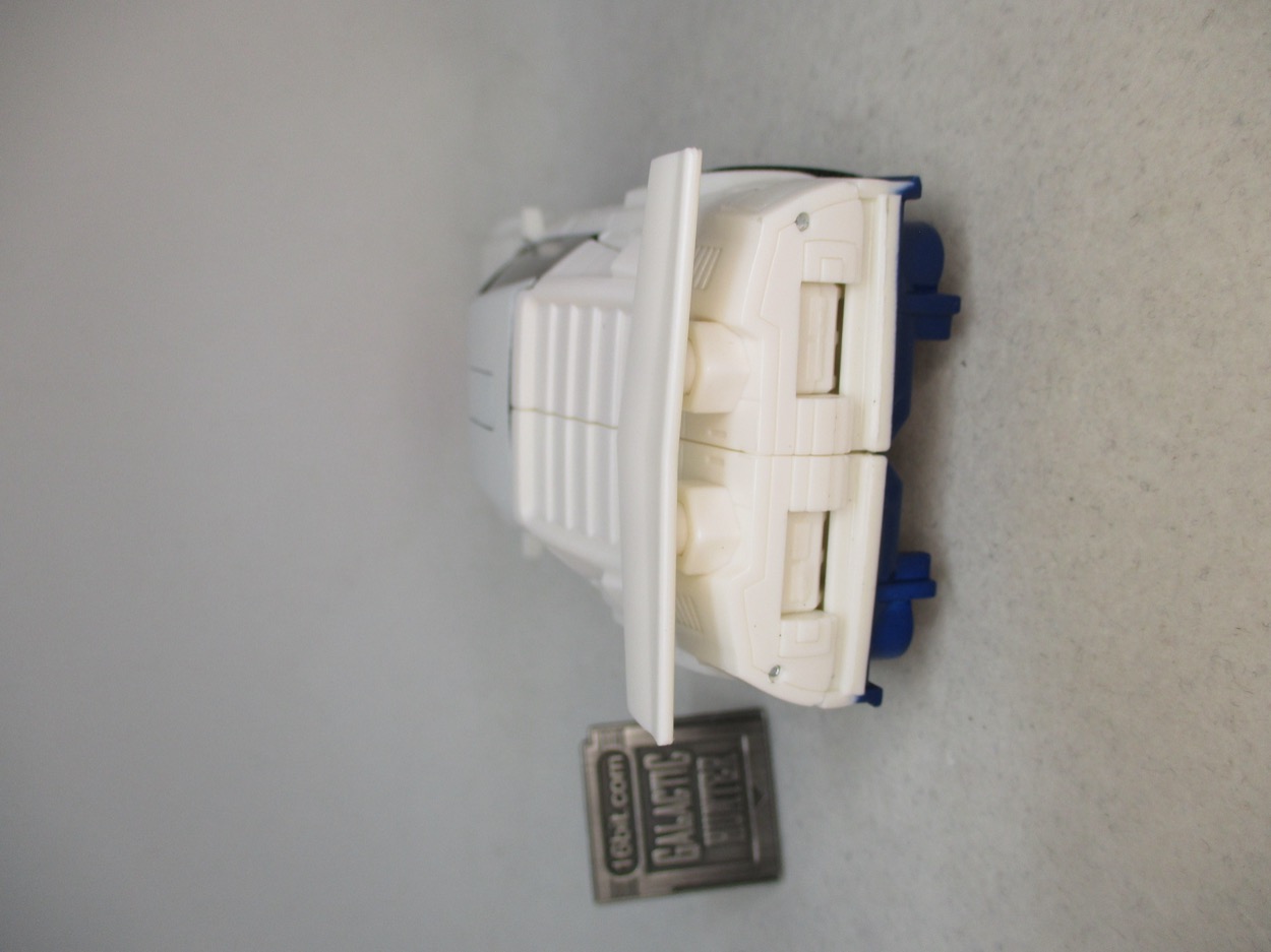It's a pretty great little toy. The G2 version is now much cheaper - it was blown out at Walmart in value-priced 2-packs for Black Friday - but you want this white one, with a red hood, the blue chest, and the lack of faux sticker adornment. Takara-Tomy and Hasbro clearly conspired to make something similar to the cartoon. You can tell, because the head has yellow eyes and not a visor, like the original toy. he doesn't have a purple Decepticon sigil on his chest though - and the white isn't quite as off-white. Still, the general swaths of color are the same and even though he doesn't have wheel shoulders, it gets the point across. Those wheels are on his backpack. I still like what they did, as it has a little more color than the cartoon model and has a fairly good range of movement for a guy whose main purpose is to be bisected and mounted on Menasor's arm.