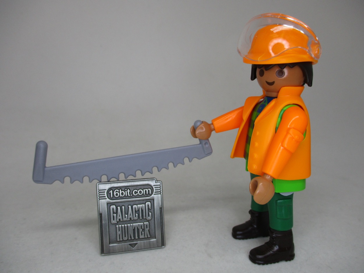 I find myself saying a variation of the phrase "you get your money's worth" a lot, and that's true of this Playmobil Lumberjack. They make a bunch of these, and this one feels a little less olde thyme with its bright green and blue plaid shirt and super-duper safe orange coat and helmet. And safety visor. This guy's going to leave with his eyes intact, people.