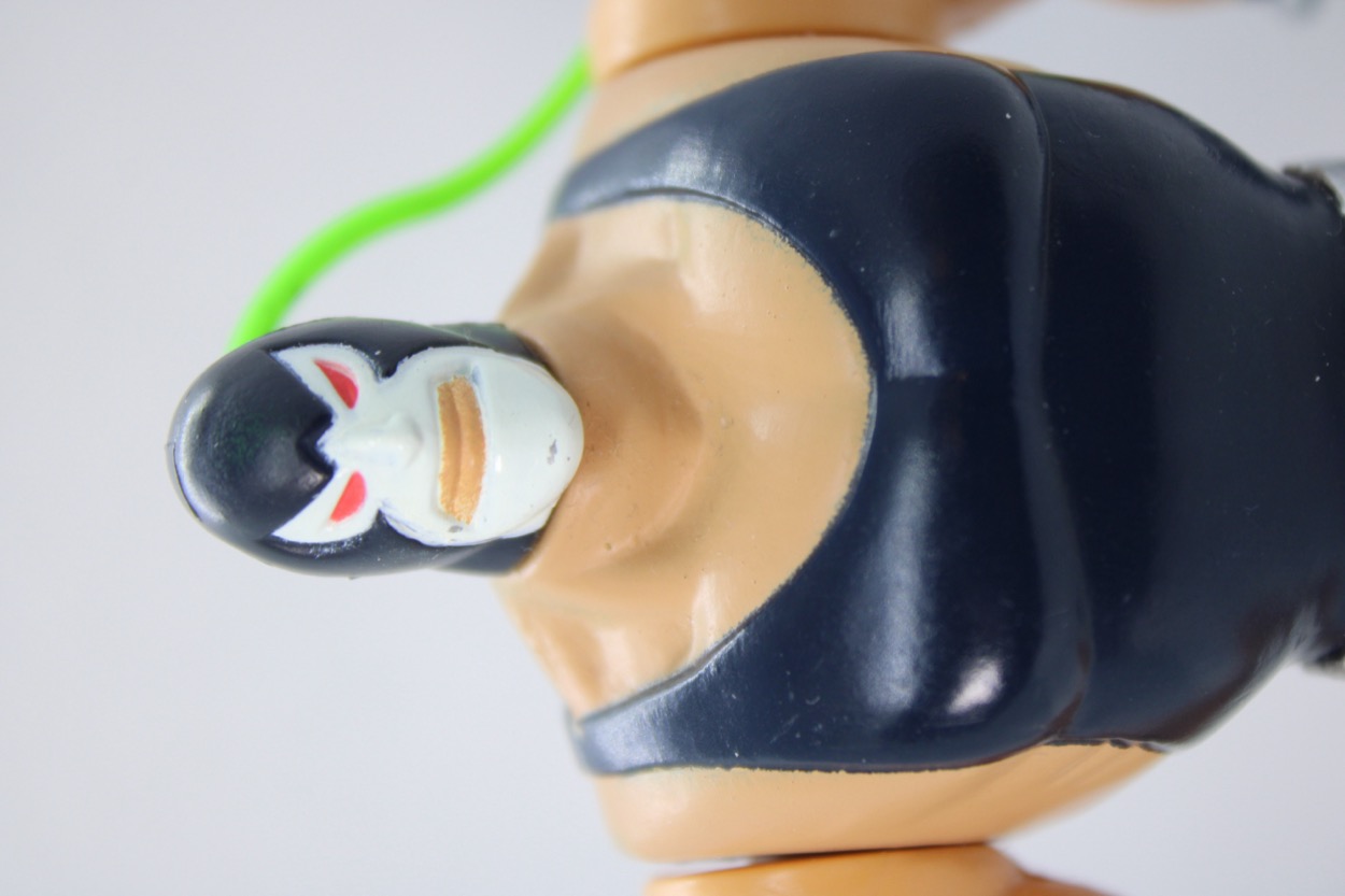 The sculpt is incredibly smooth, just like the cartoon. Warner Bros. Studio Stores (also formerly at malls) sold a lot of super-fancy high-end maquettes of characters from the show, and while they were cool I failed to see the value in them when Kenner had these guys for six bucks. The poses weren't as cool, but also, they weren't $150-$200. Bane's sculpt isn't much more complicated than the line art from the show - you get a venom hose connecting his skull to his wrist, a belt, and some very basic muscles (with veins) and boot laces. It's a figure that looks incredibly powerful, and a little goofy, towering over other Kenner figures at about 5 1/2-inches tall.