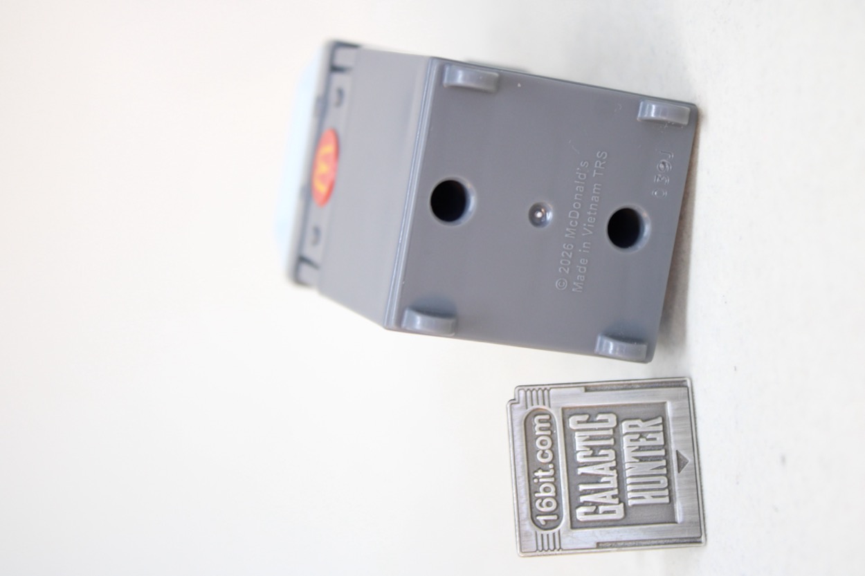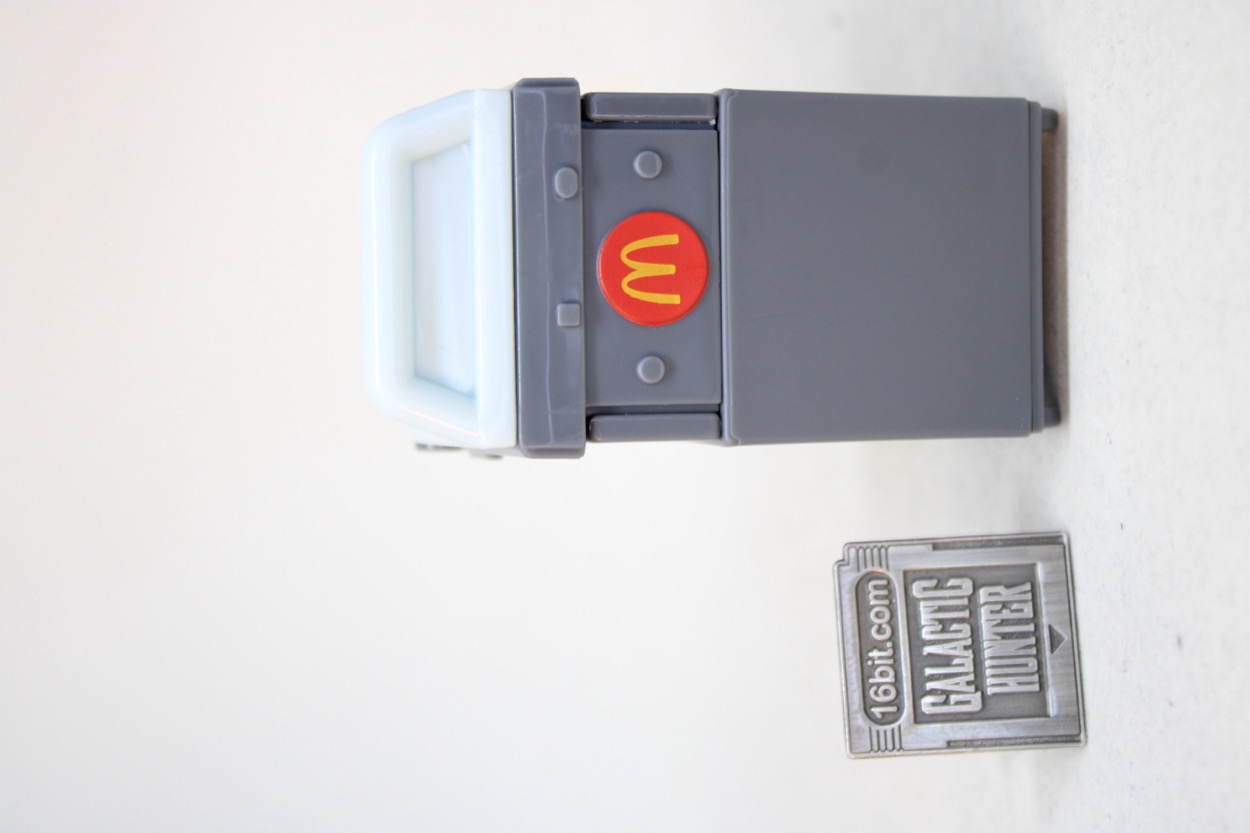 I grabbed a handy Kenner Admiral Ackbar on my desk as I type this, and his baton hand is about right to spatula up some burgers. Well, the right height. You're not going to get any meat with a ringed stick, or at least not in a way that can be described while maintaining any semblance of a site for all-ages. The 3 3/4-inch-ish scale grill has an opening lid revealing two cooking, tiny hamburger patties. If you bought this toy, you will be reminded that what you ate was only marginally larger, and you are likely still hungry. There are knobs on the front as well as a big yellow M in a sea of red. It is worth noting that Admiral Ackbar also seems dressed in McD straw cosplay pants.