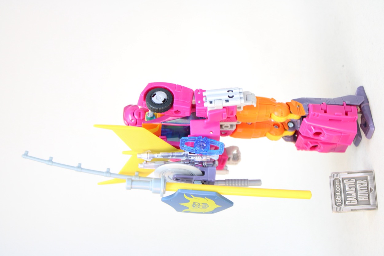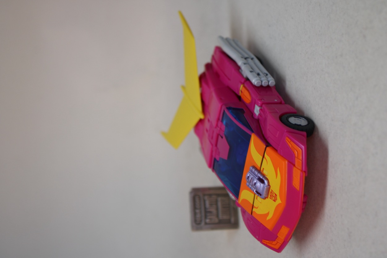 The car looks great, and is a vast improvement over the last one. A huge yellow joint marred the roof of the original, which this fixes. I prefer the new magenta colors, but the orange and yellow (and gray) from his arms are something of an eyesore. Perhaps if Hasbro and Takara-Tomy try again - and oh, I hope they don't - they might make the change. They may also elect to paint the center of the big yellow spoiler, but I don't really feel it's necessary. His flames look great, the blue windshield looks good, and the pipes are fine. Takara-Tomy has a Transformers Masterpiece Edition MPG-20 Hot Rod Style Gen coming, which actually paints the spoiler, and fixes the elbows, but the forearms are still visible in car mode. And he's not magenta. Also, he's $125. Is it worth it? Not to me, but a larger toy built on the same form is possible for those who want to pay up. The wheels of the Style Gen toy are also much nicer... but it's not magenta. And it lacks the gear.