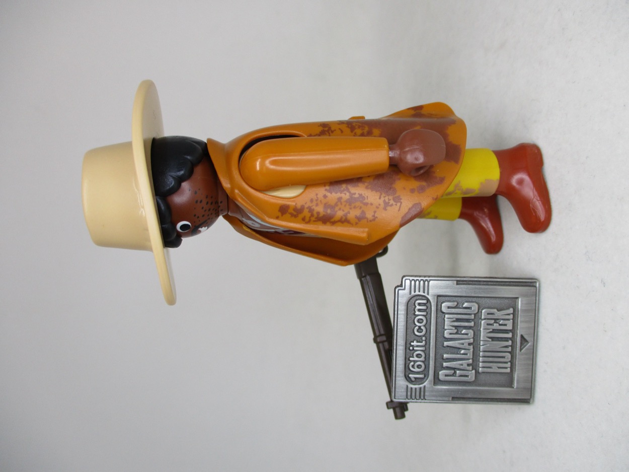 Assembly is pretty easy - legs go in a grey piece, the coat goes over the torso, the arms go in the torso, the legs go in the torso, then the head goes in. Add the hair and hat, and you've got a nifty figure that fits right at home as an adventurer, a cowboy, or the star of any western fanfic you've been working on. His hat fits perfectly, and the hands fit perfectly on the rifle. Playmobil figures are consistent - simple sculpts, but everything works.