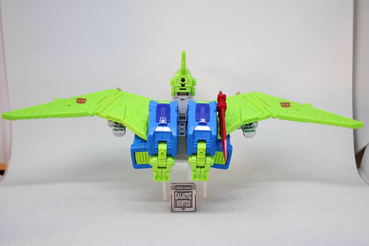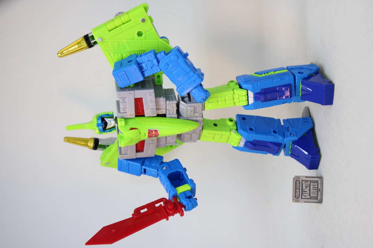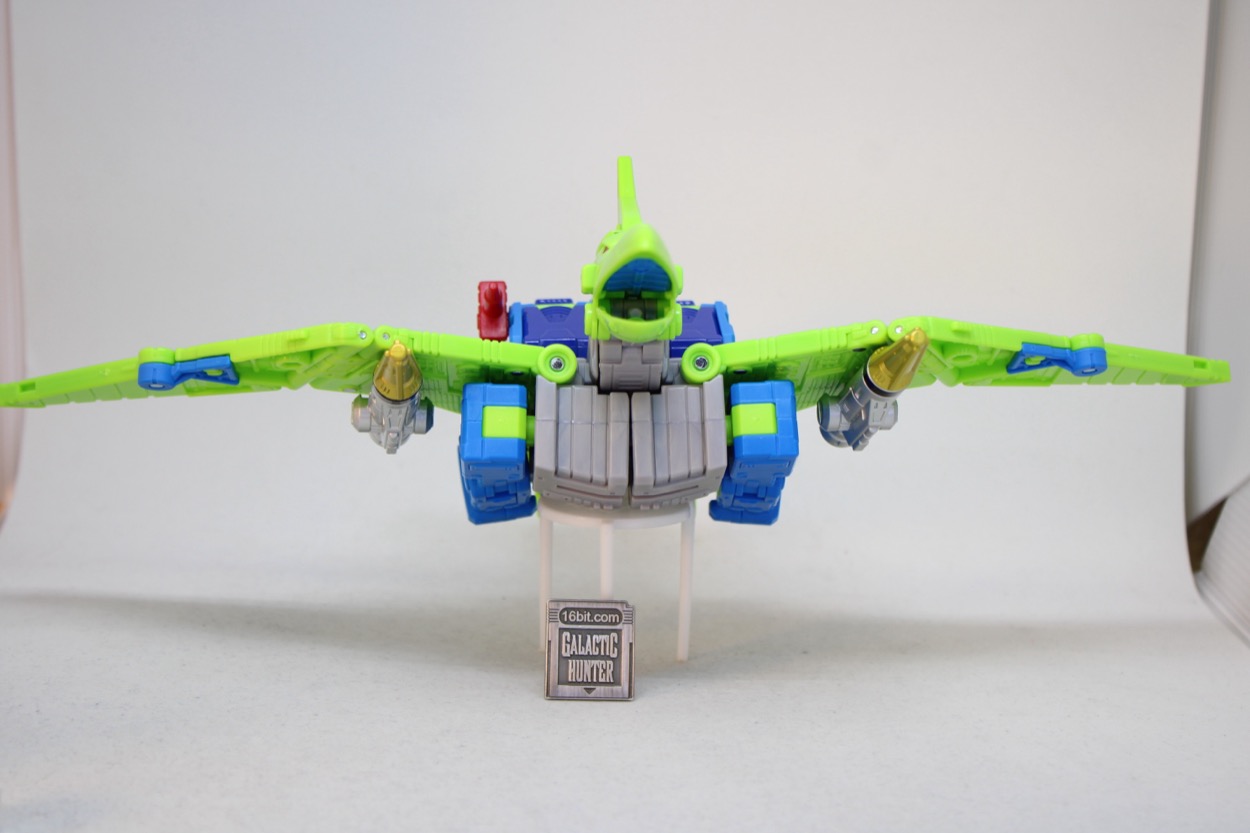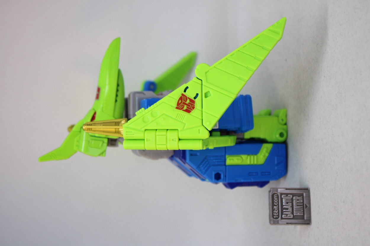 The robot mode is nicely jointed, and the flying reptile/prehistoric not-a-bird/whatever pterosaur has moving wings, toes, jaw, and neck. That's pretty good, most dinosaur toys don't have much movement. You can plug his blasters in his wings, plus he can carry the sword on his back with 5mm sockets. It looks great, but I wasn't really expecting the beak, crest, and head to all be the same green. The red eyes pop nicely, there are a lot of circuit details sculpted all over, and it pretty much delivers on the promise of the concept art.