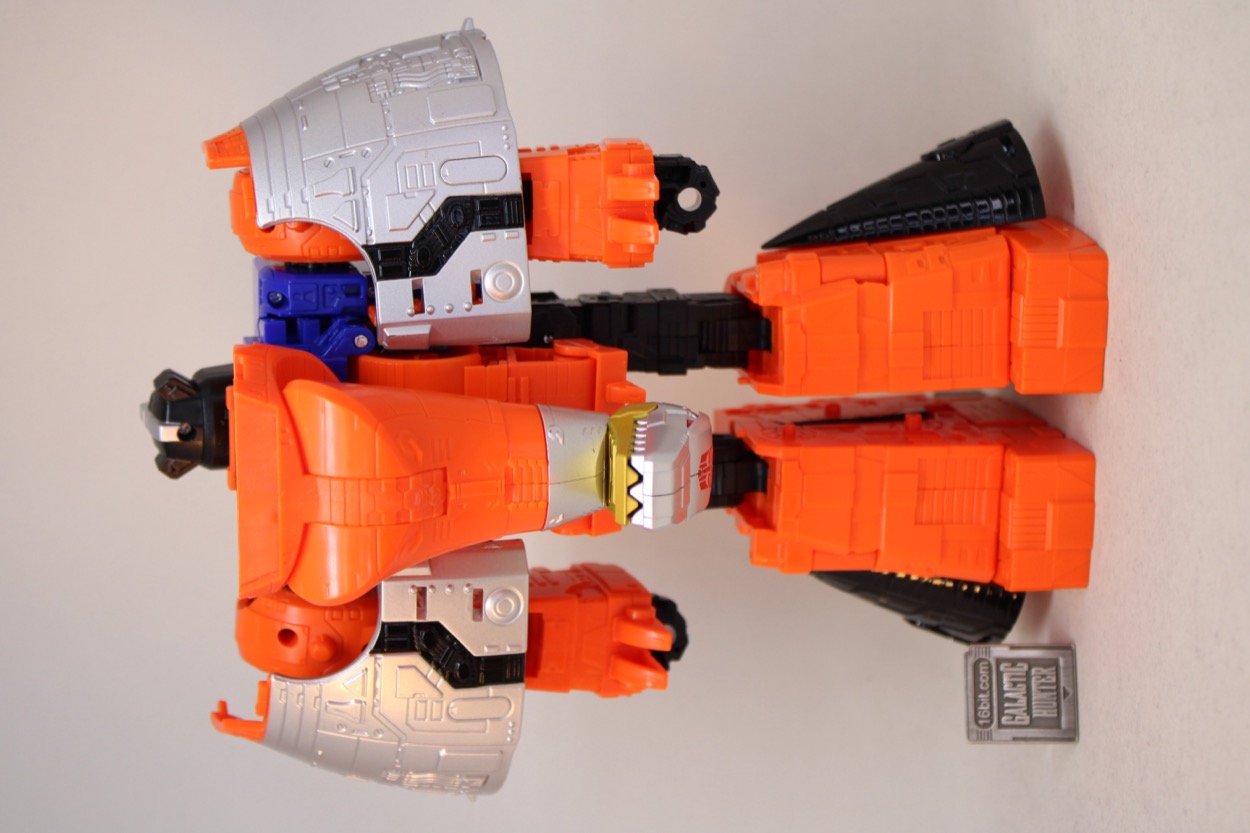 Sludge is big and dumb, and the toy is bright and orange. It's hard to parse the scan of the artwork I've seen online, so I wasn't quite expecting a mostly-blue chest with a mostly-orange body. It's a lot more Halloween in its persona than I would have anticipated. Hasbro did a great job painting the dinosaur shell "wings" with silver on the insides. I love how it looks, but I would have loved a few more painted details to simulate stickers from the concept art. It's still really good, but I would have liked more detailing in the black portions. He has his blaster, and you can swipe one of Swoop's swords if you want. I handed him the spare Grimlock sword, which looks pretty nice.