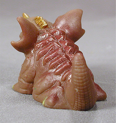 This small plastic figure is fairly ornate for what he originally cost. Molded in orange plastic, he has dark brown/orange paint bringing out detail in numerous places. Also, there's a fair amount of silver on his claws and around his face. The texture sculpted into his back is really quite astounding for his size, especially considering that the American equivalent, fast food premiums, never really looked this good. For this reason, some of the images are larger than usual.