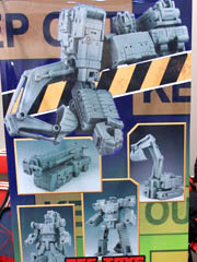 Each piece of the construction vehicle robot is said to be sized larger than a deluxe toy, but smaller than a voyager toy. Costs were not divulged, but history pegs these big toys at $80ish a pop-- so the whole of Devastator's unlicensed brother could cost you as much as $500 after shipping and such. Start saving kids, the combined mode is enormous.