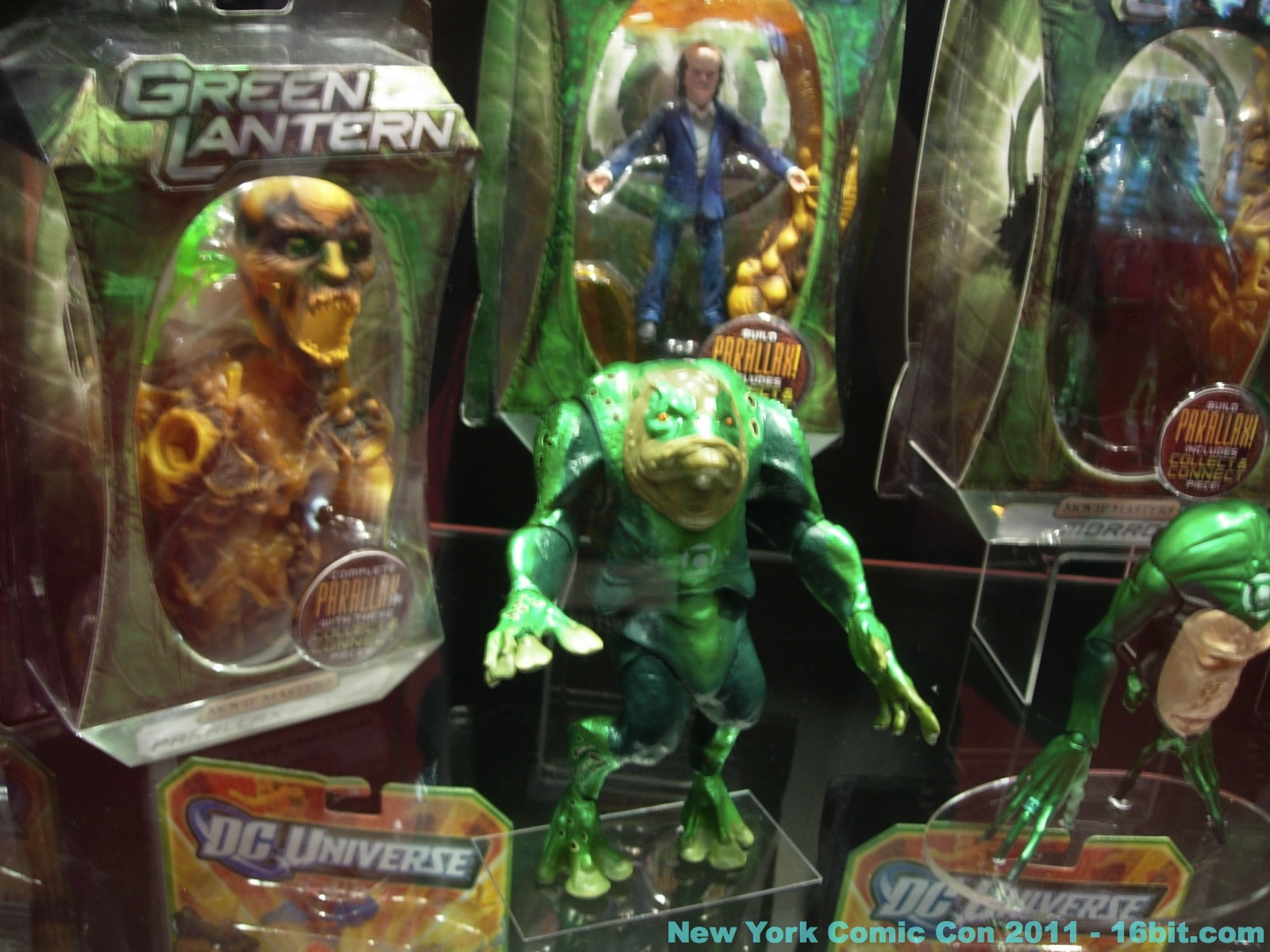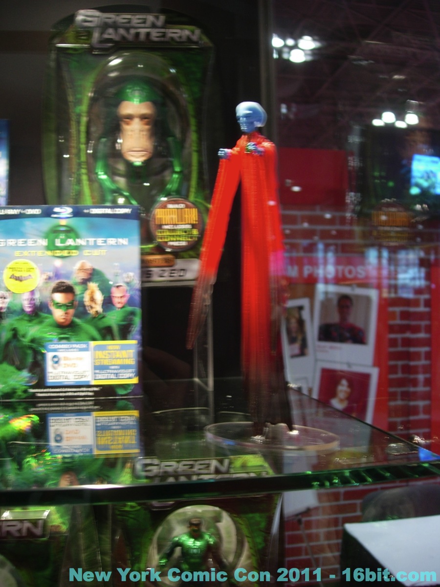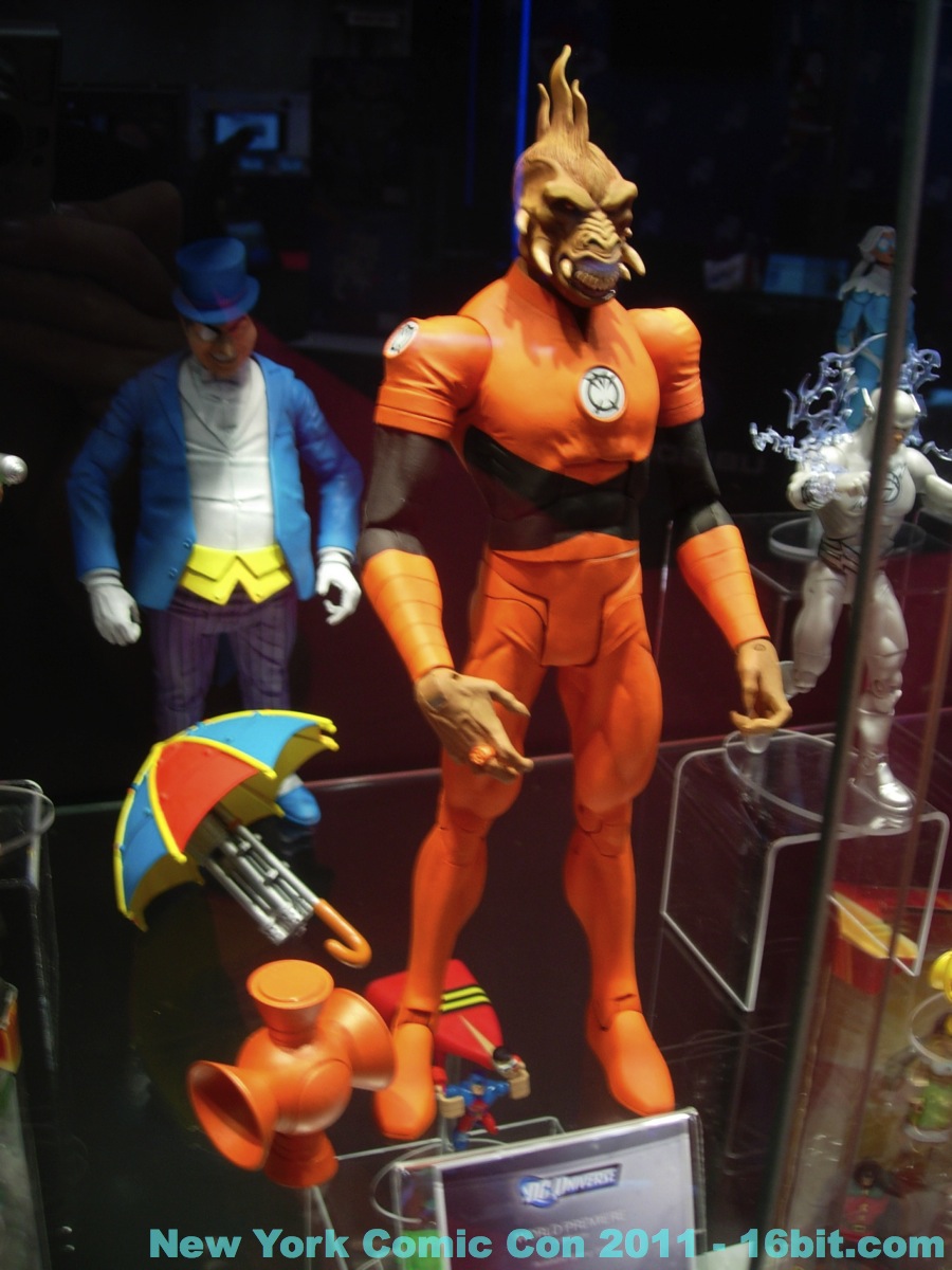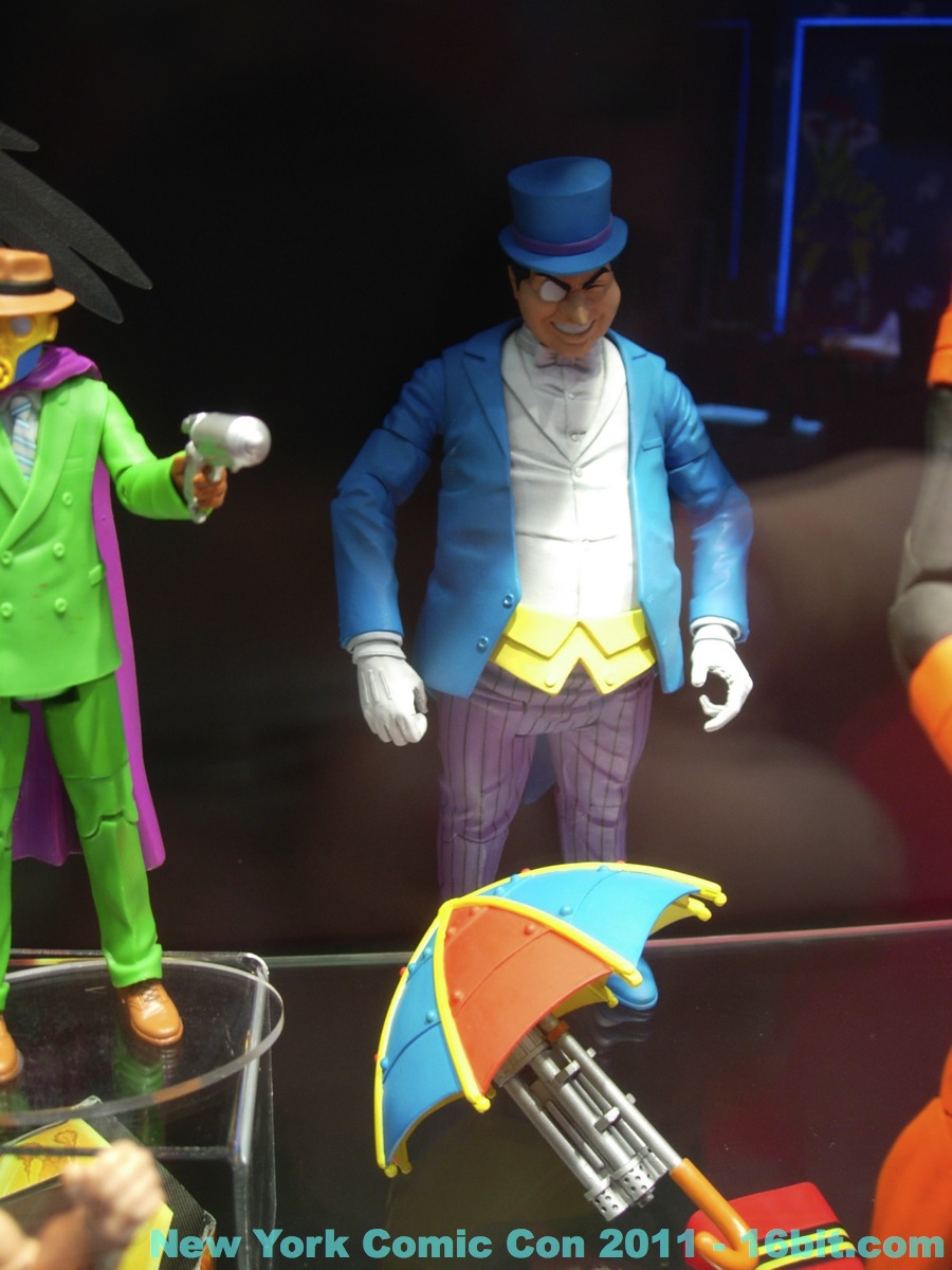 No new exclusives! A number of SDCC exclusives from July were brought to New York, but nothing new was on sale at the show-- which is good for people that have to travel to hunt this stuff down. Few new items were revealed, but you can get in-package glimpses of the latest Green Lantern Movie Masters which also has a complete Parallax build-a-figure. Two-ups (I assume) of new Toys R Us 2-packs bring Batman, and new versions of Hal Jordan back into the line-- again-- because we love them. A Super Powers-inspired Penguin was a delight to see, with its blue outfit and matching top hat. Young Justice had a few new things out, but given that I was working the show as well as snapping photos I didn't have a lot of time to re-check for new additions throughout the show. So here's what I saw.