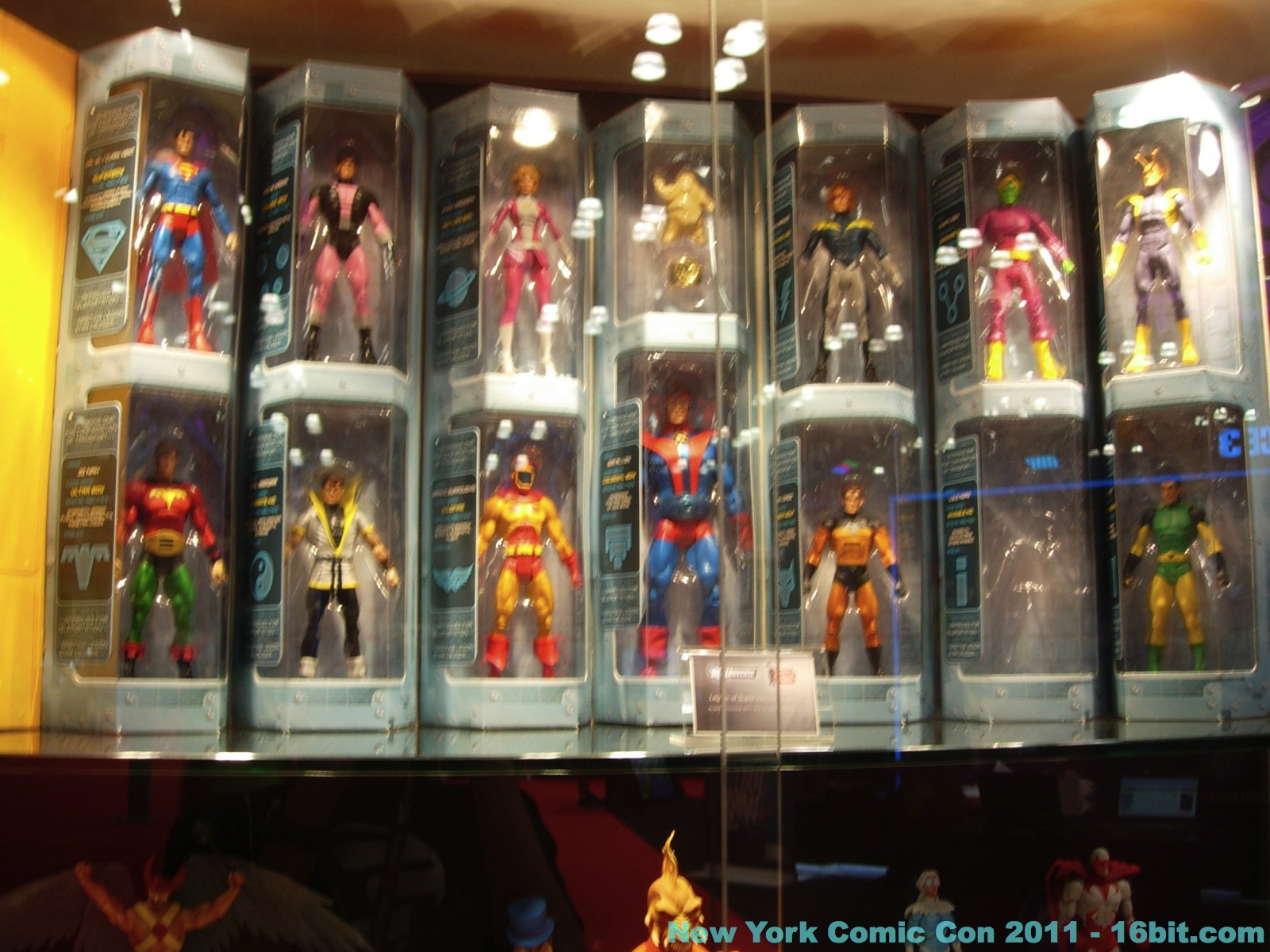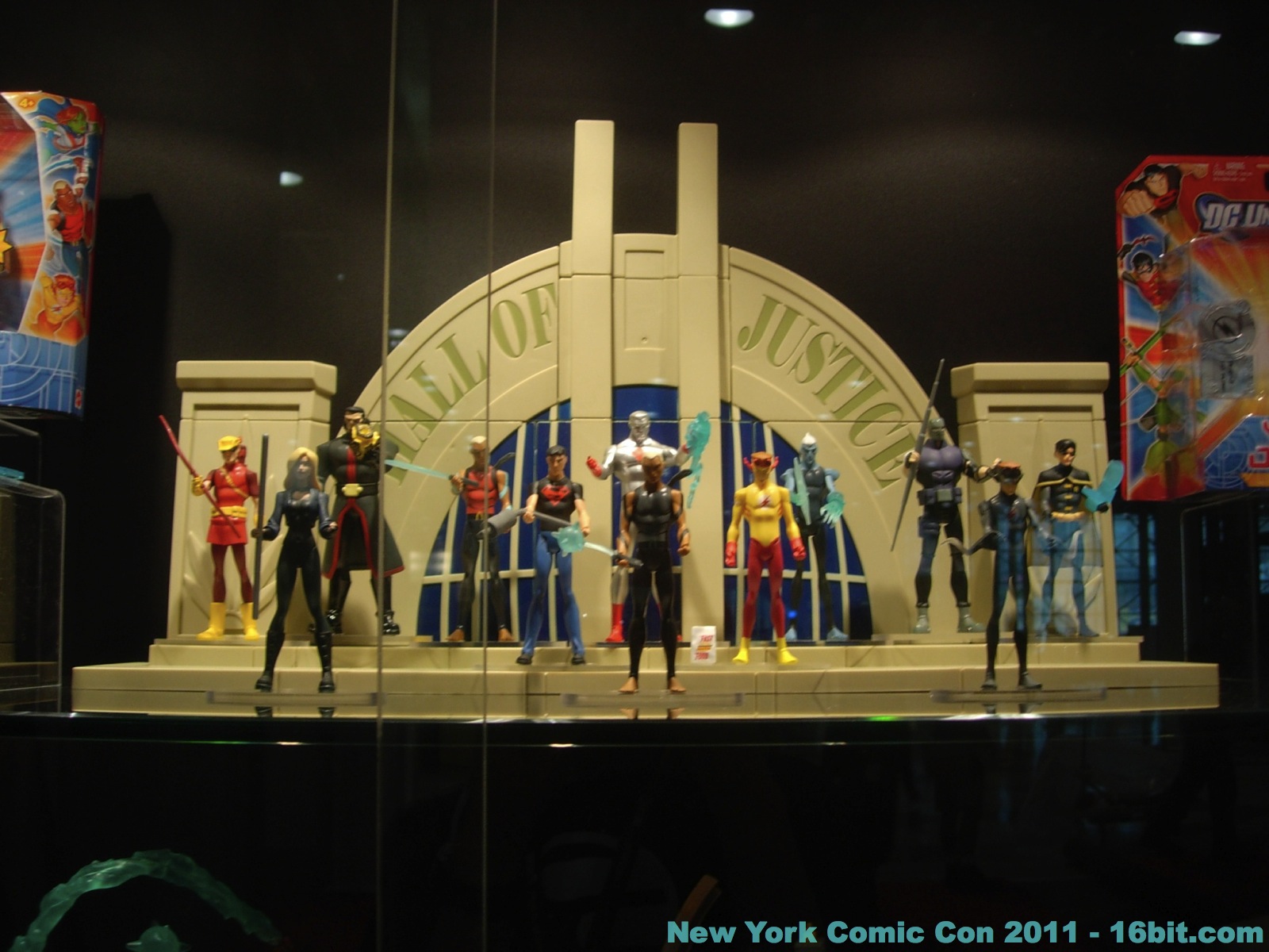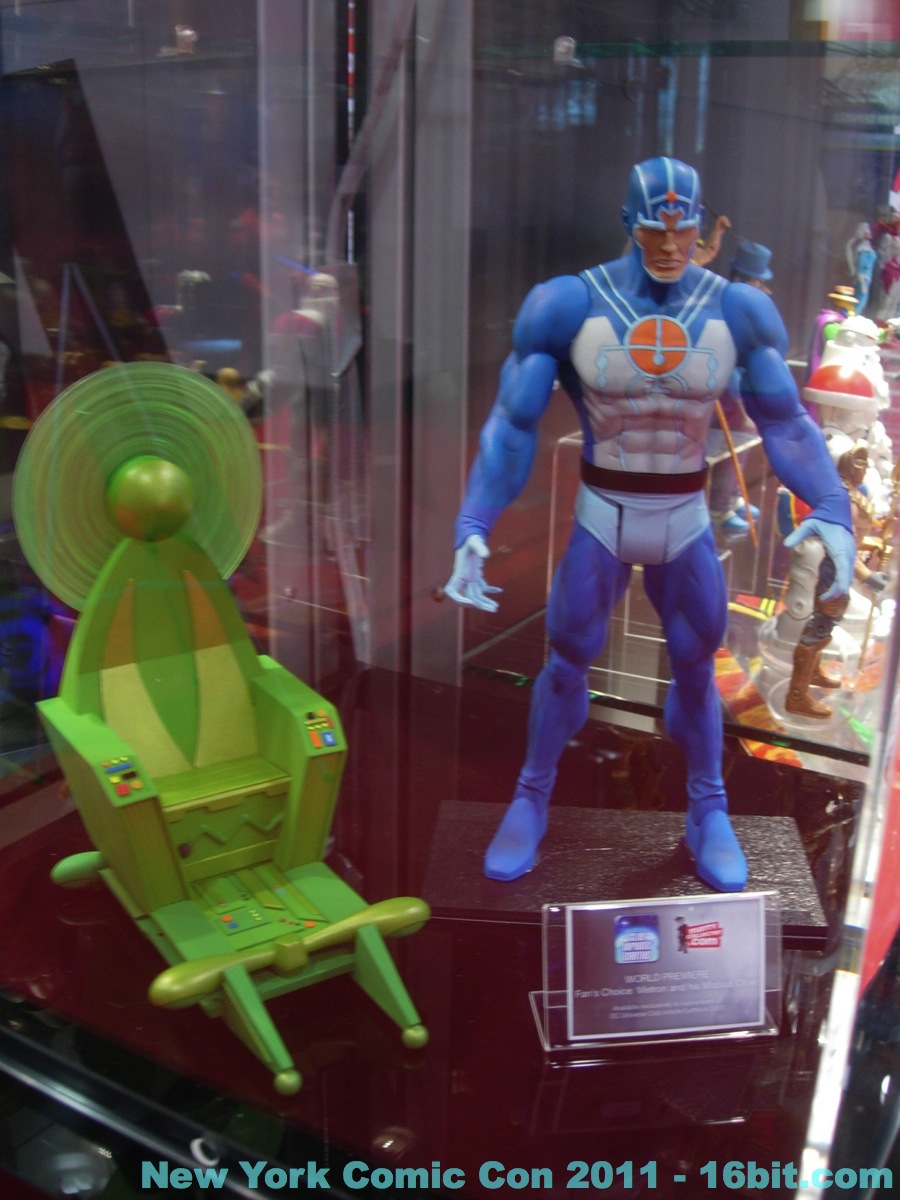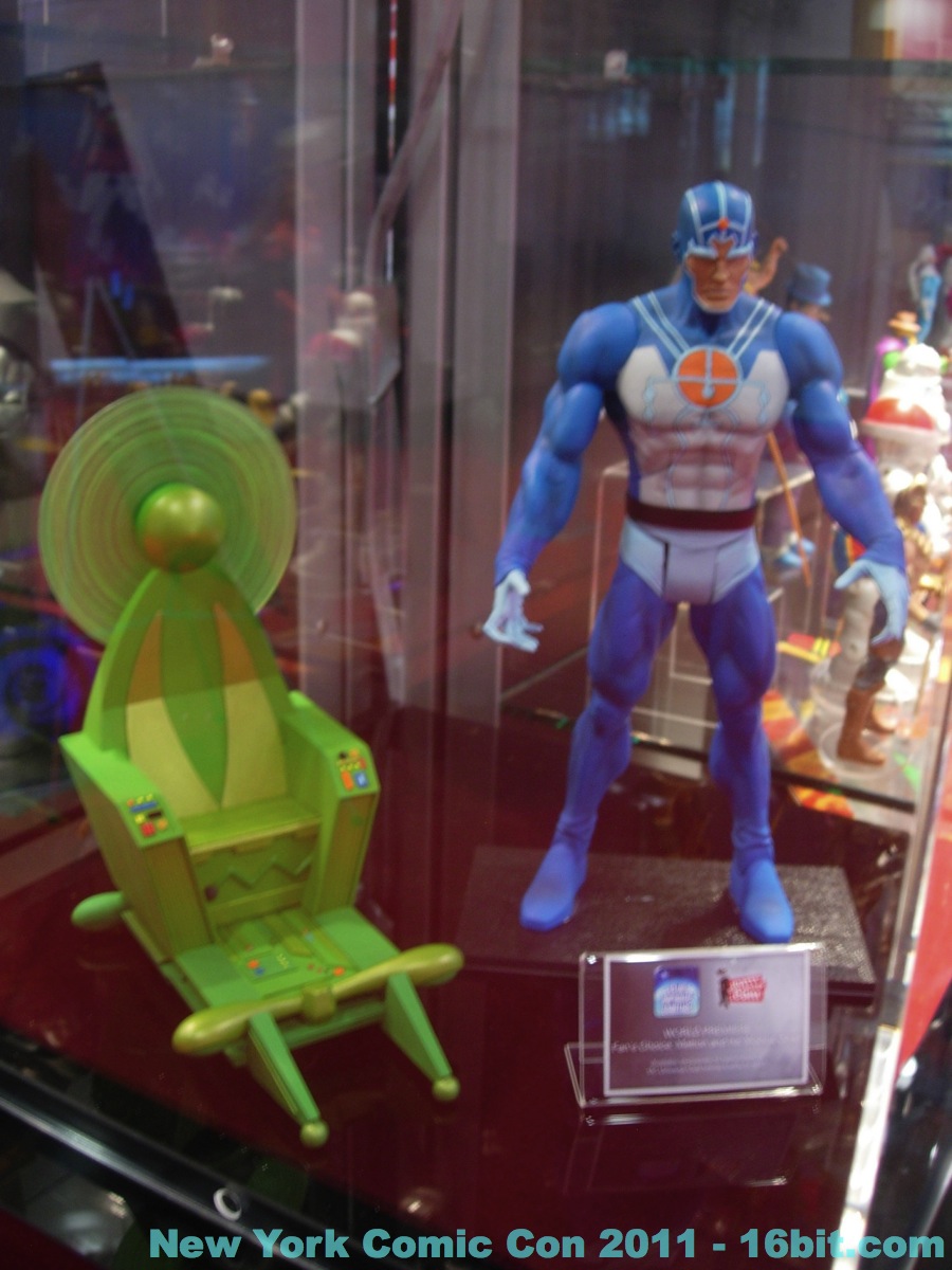 No new exclusives! A number of SDCC exclusives from July were brought to New York, but nothing new was on sale at the show-- which is good for people that have to travel to hunt this stuff down. Few new items were revealed, but you can get in-package glimpses of the latest Green Lantern Movie Masters which also has a complete Parallax build-a-figure. Two-ups (I assume) of new Toys R Us 2-packs bring Batman, and new versions of Hal Jordan back into the line-- again-- because we love them. A Super Powers-inspired Penguin was a delight to see, with its blue outfit and matching top hat. Young Justice had a few new things out, but given that I was working the show as well as snapping photos I didn't have a lot of time to re-check for new additions throughout the show. So here's what I saw.