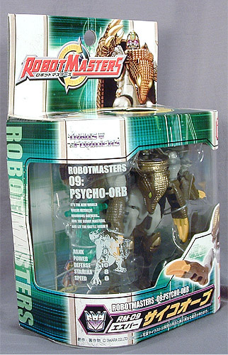 Psycho Orb is a Destron warrior in the TransFormers Robot Masters line of toys from Takara. Released only in Japan, this toy includes two weapons that are formed from his feet and a clear green shield, the latter of which is available only in this set.