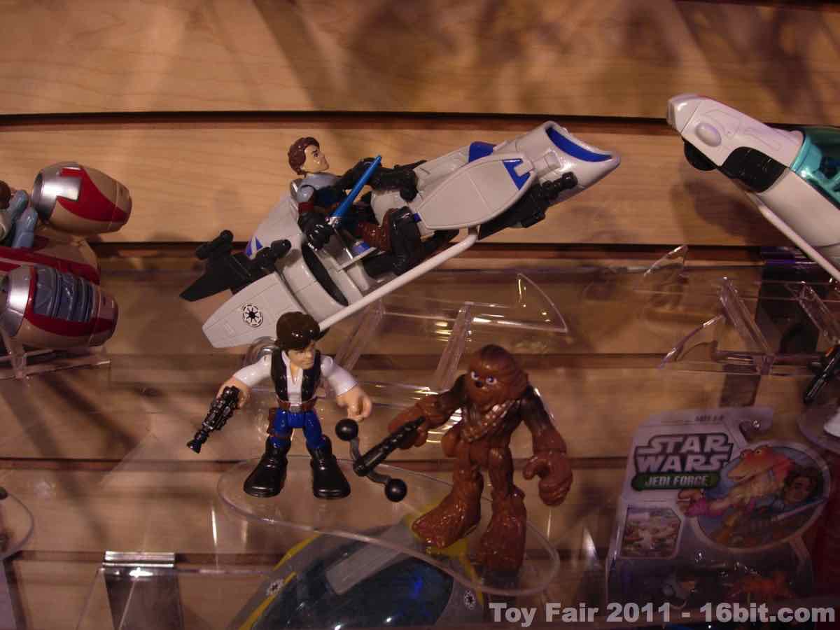 As toys, this line seems to be really something-- all the figures from the lines can be shared in one another's vehicles or playsets, and even the Transformers have little human counterparts. My favorite items are the Millennium Falcon with Han and Chewie, a really swell simple transforming Optimus Prime, and I think Iron Man vs. Doctor Doom will be a must-buy. It's a great time to be a spoiled kid, because there are more new Star Wars movie vehicles in this range than were shown for the entire collector/movie line this year. So far, anyway.
